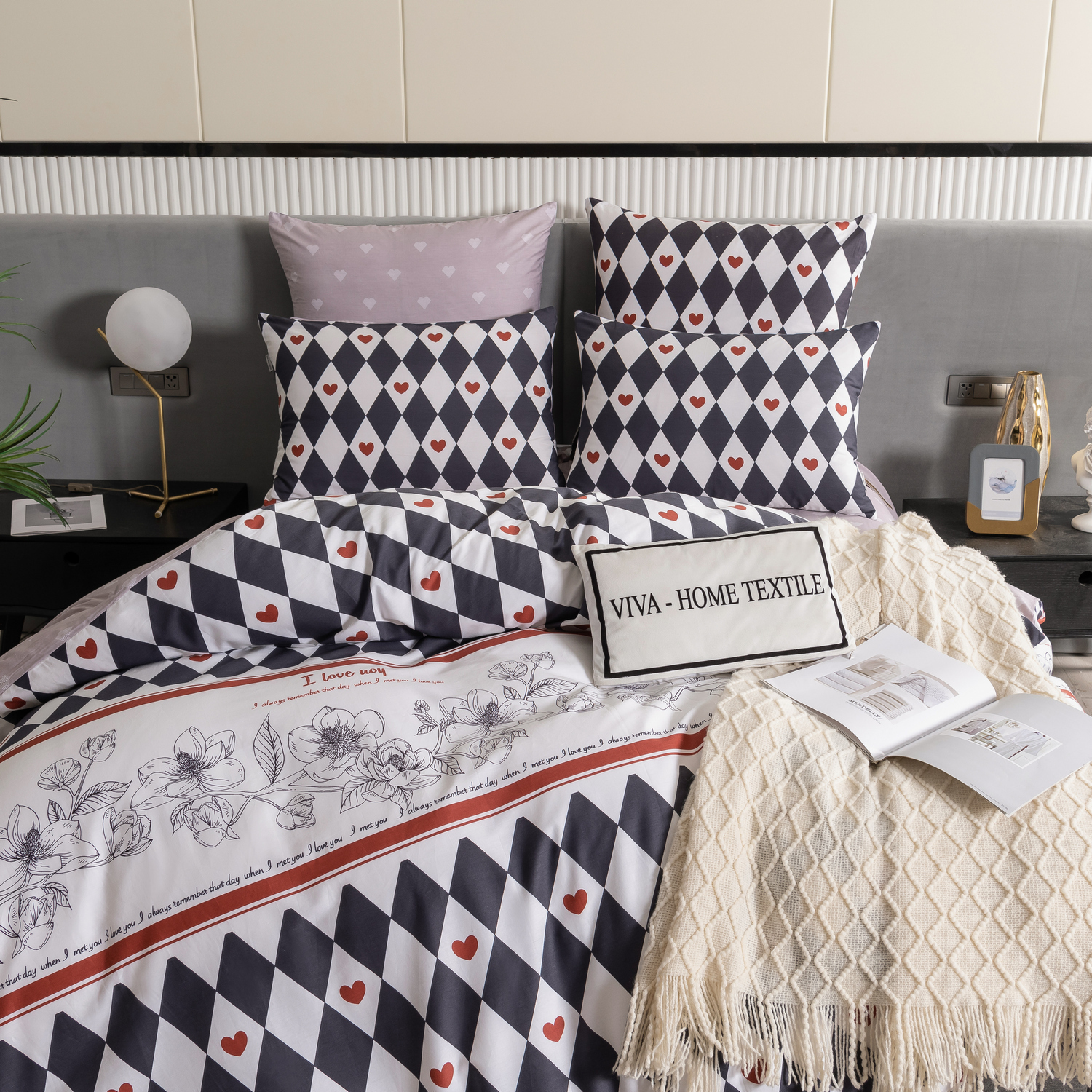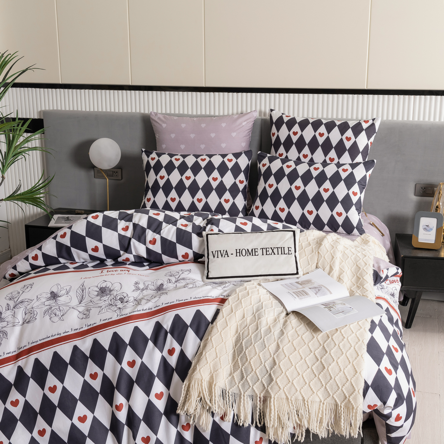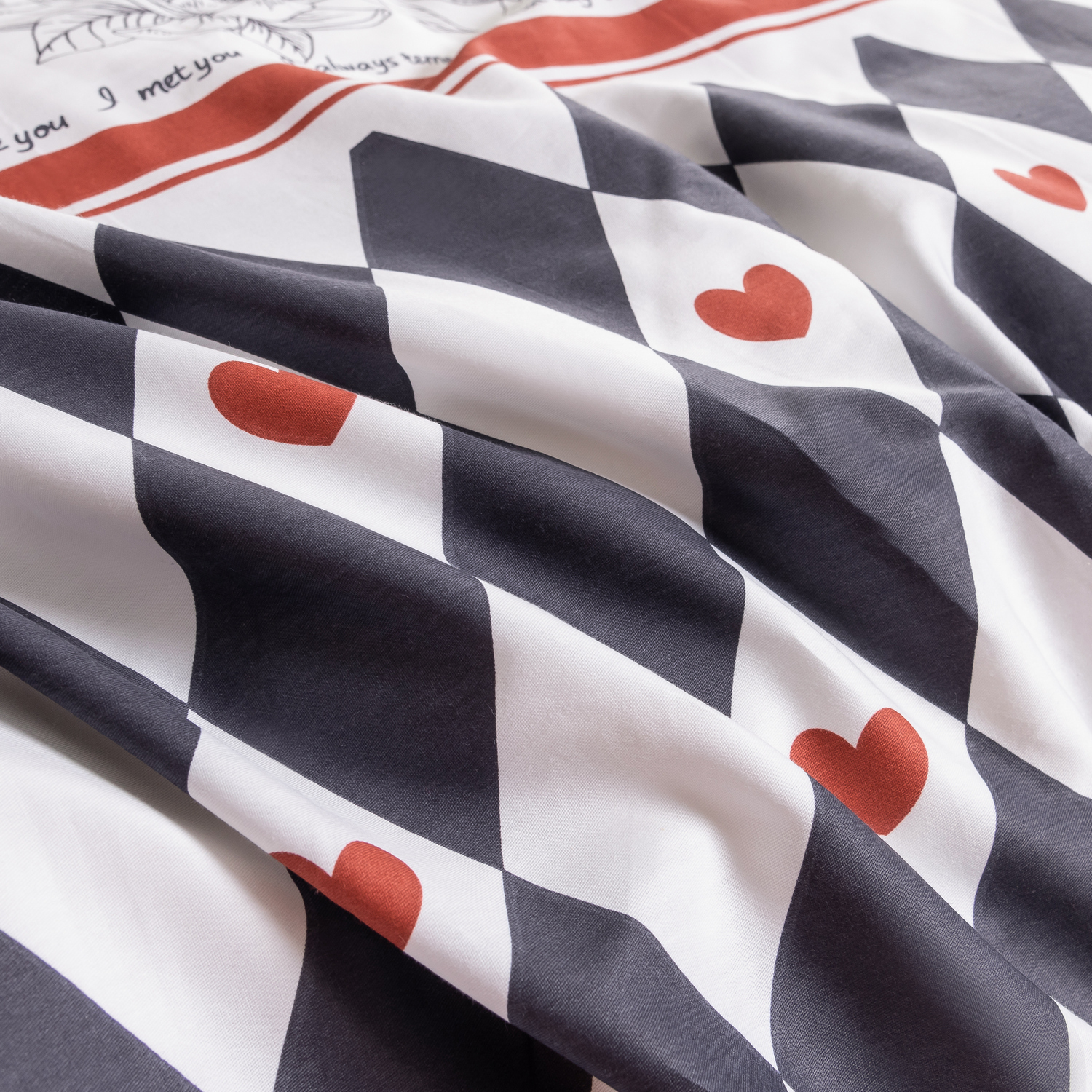 Ткань компаньон: Наволочки с разных сторон разной расцветки, пододеяльник с разных сторон разного цвета, простыня такого же цвета, как низ пододеяльника.