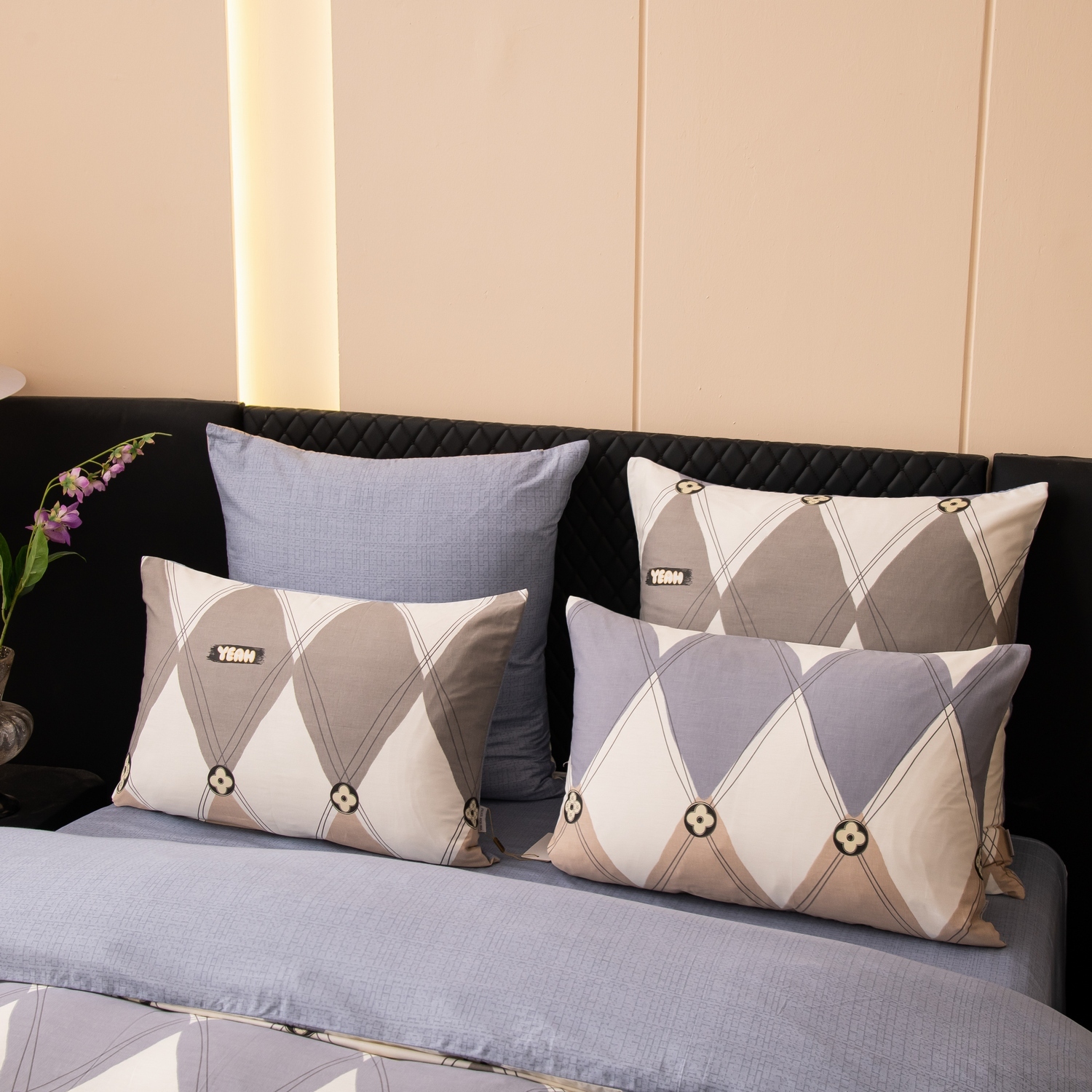 Ткань компаньон: Наволочки с разных сторон разной расцветки, пододеяльник с разных сторон разного цвета, простыня такого же цвета, как низ пододеяльника.