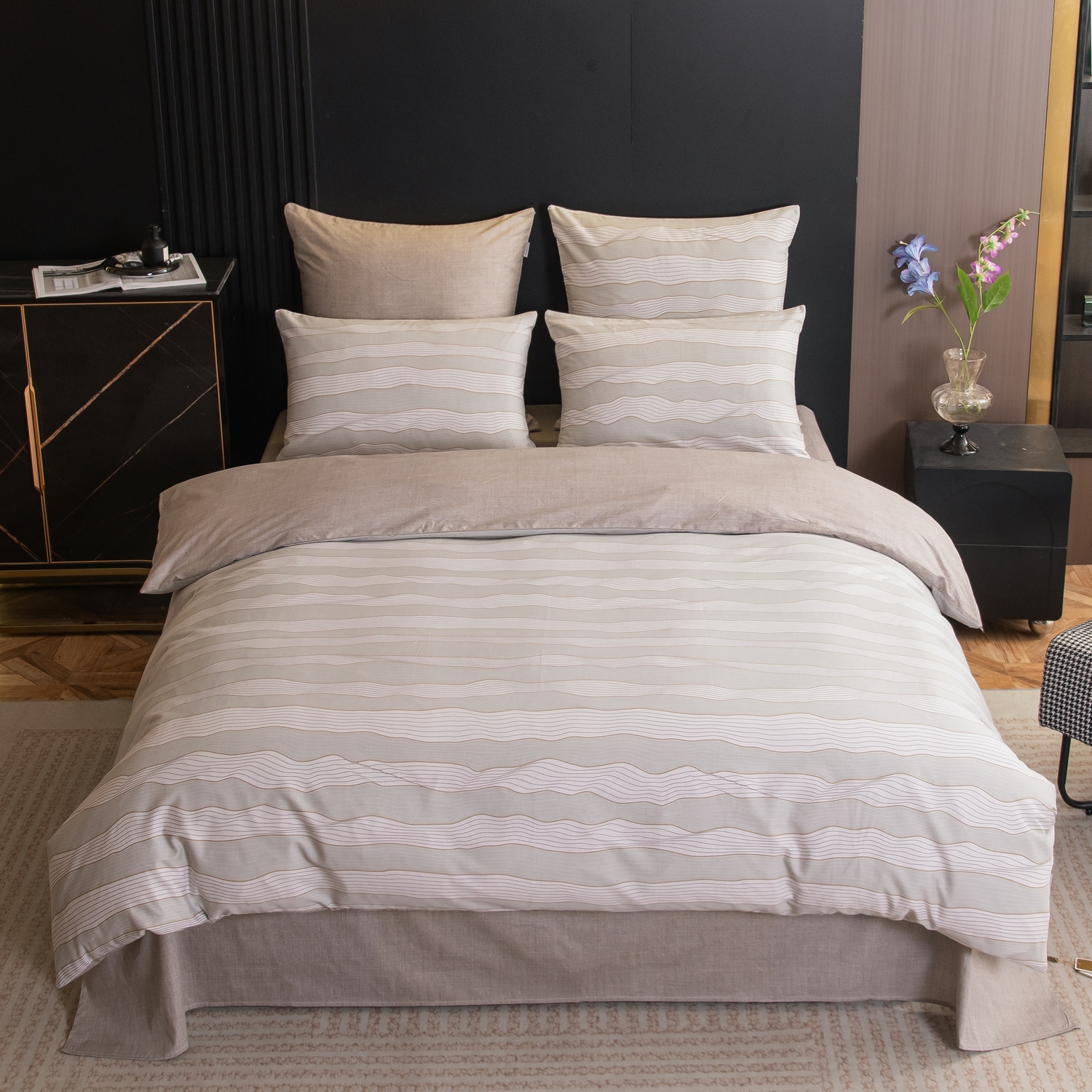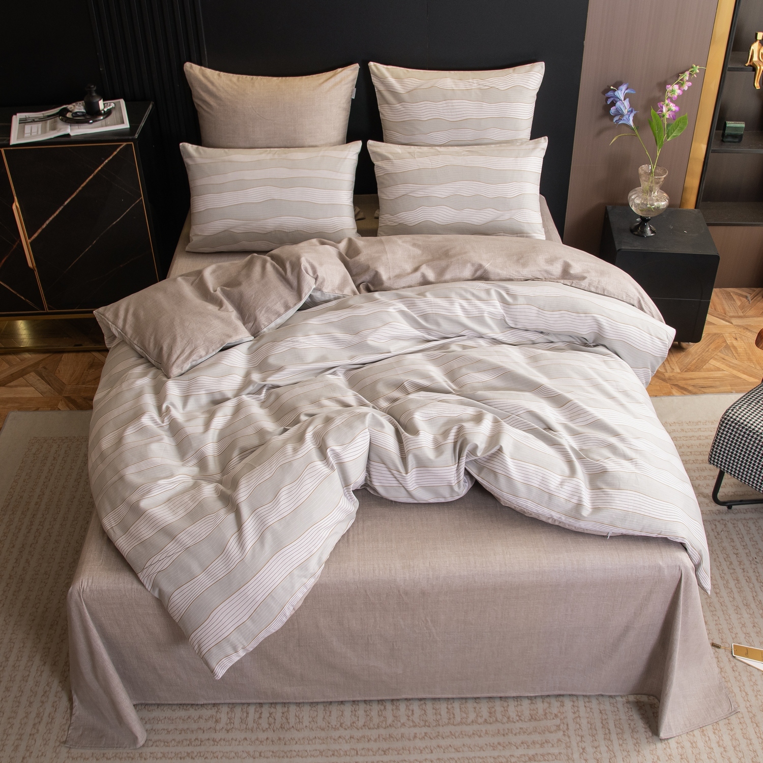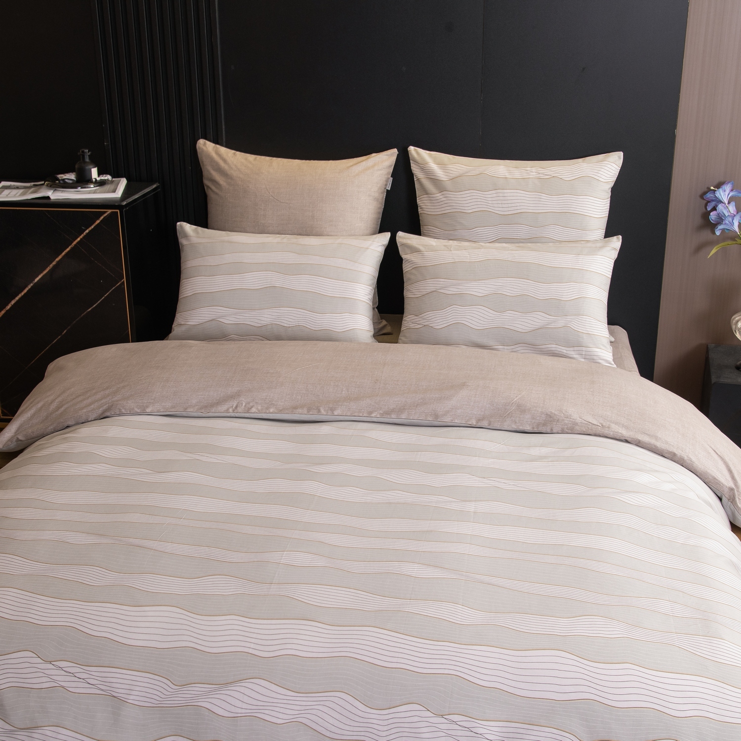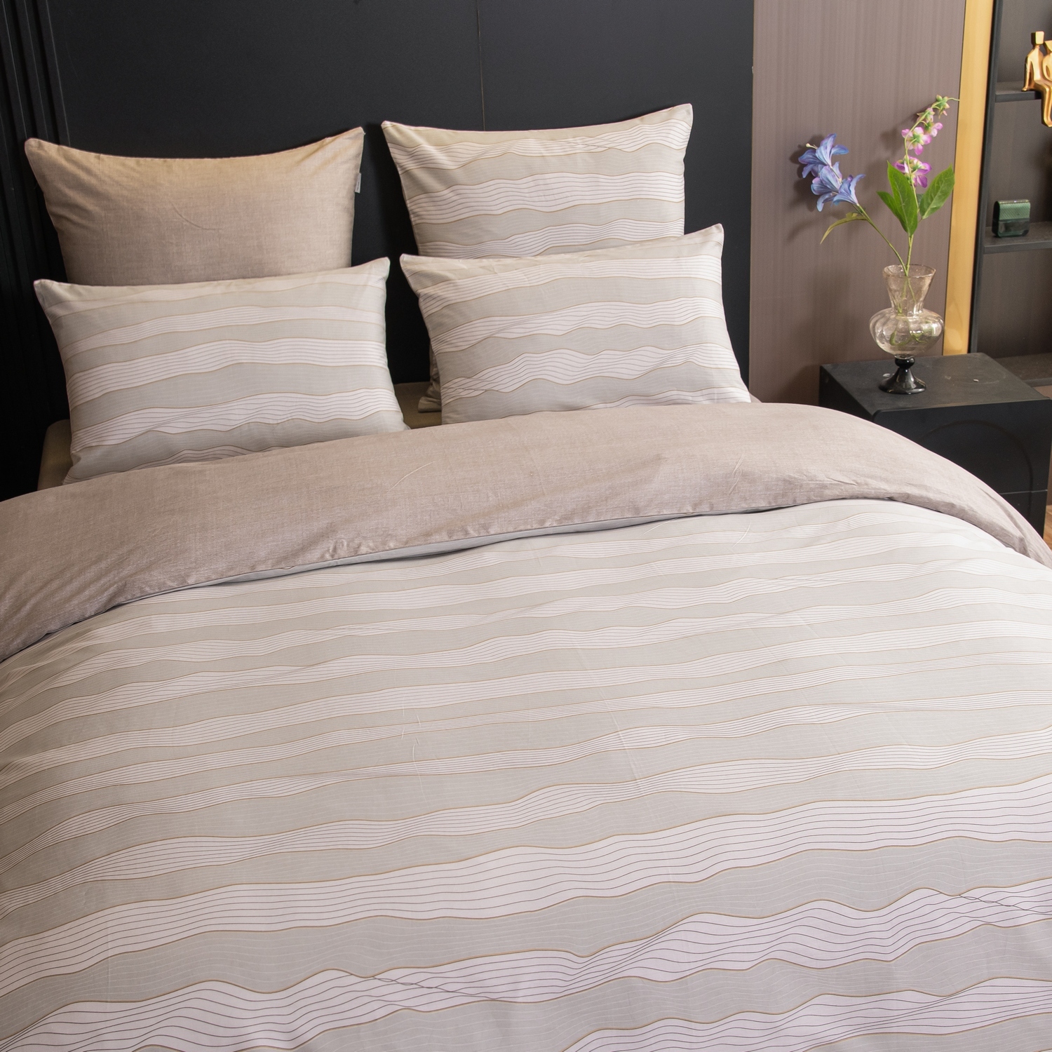 Ткань компаньон: Наволочки с разных сторон разной расцветки, пододеяльник с разных сторон разного цвета, простыня такого же цвета, как низ пододеяльника.