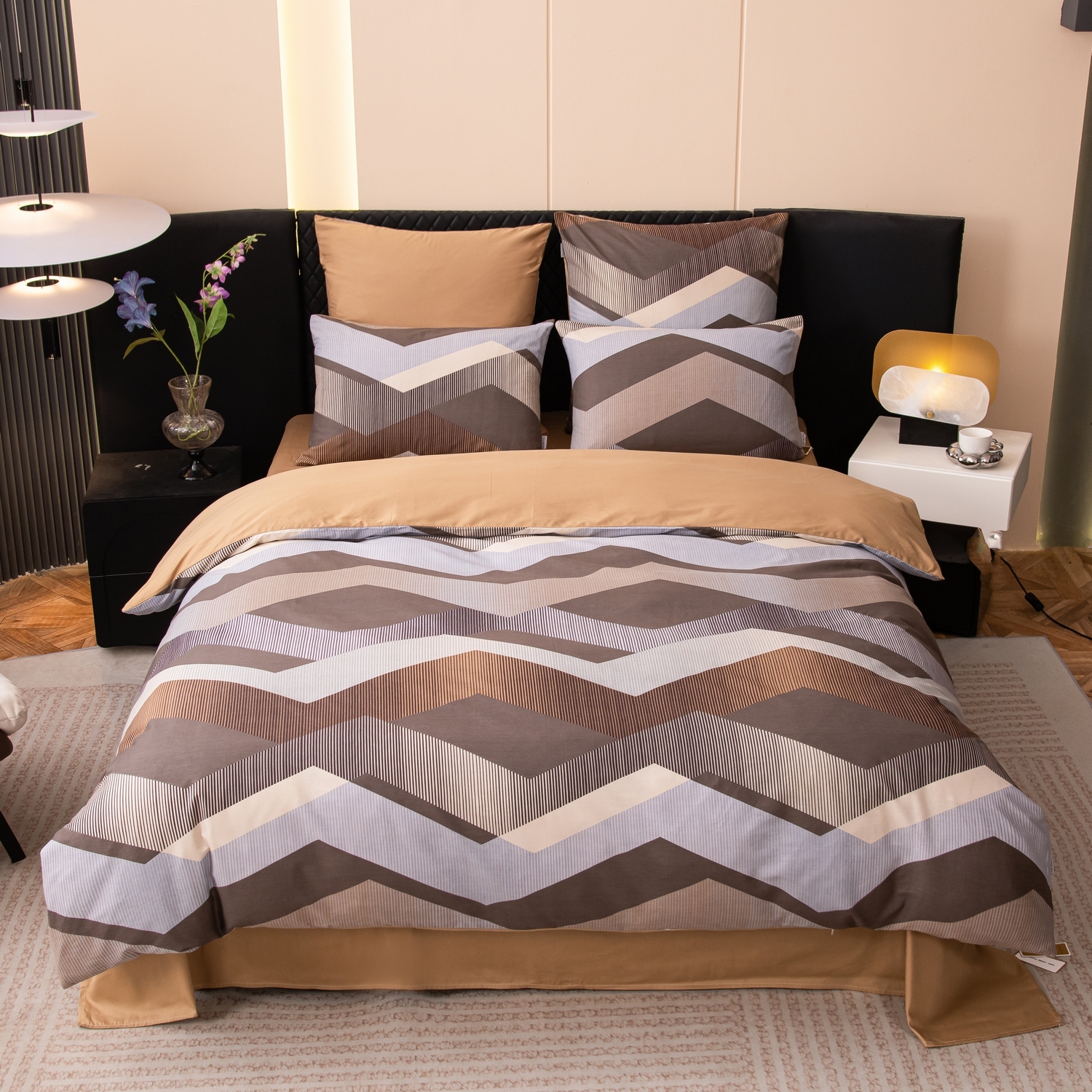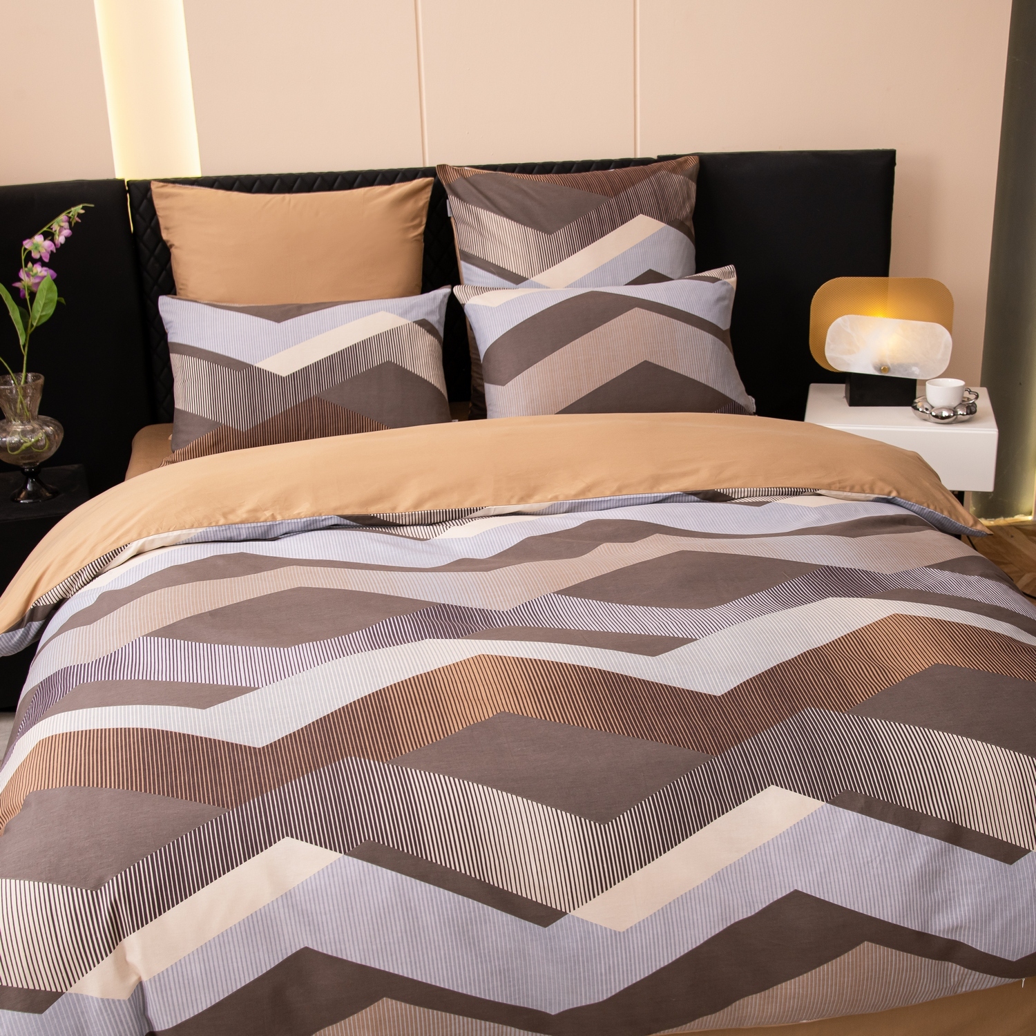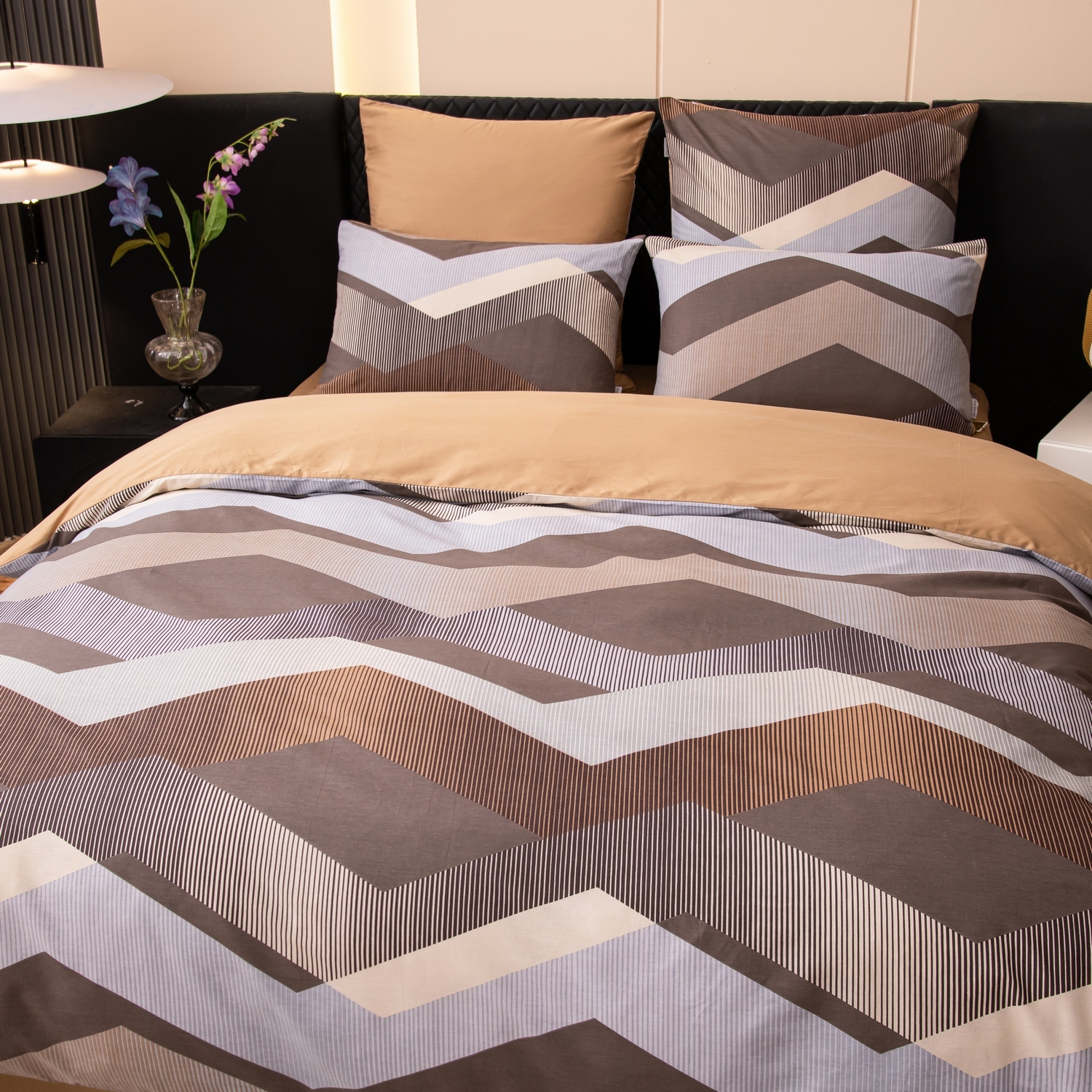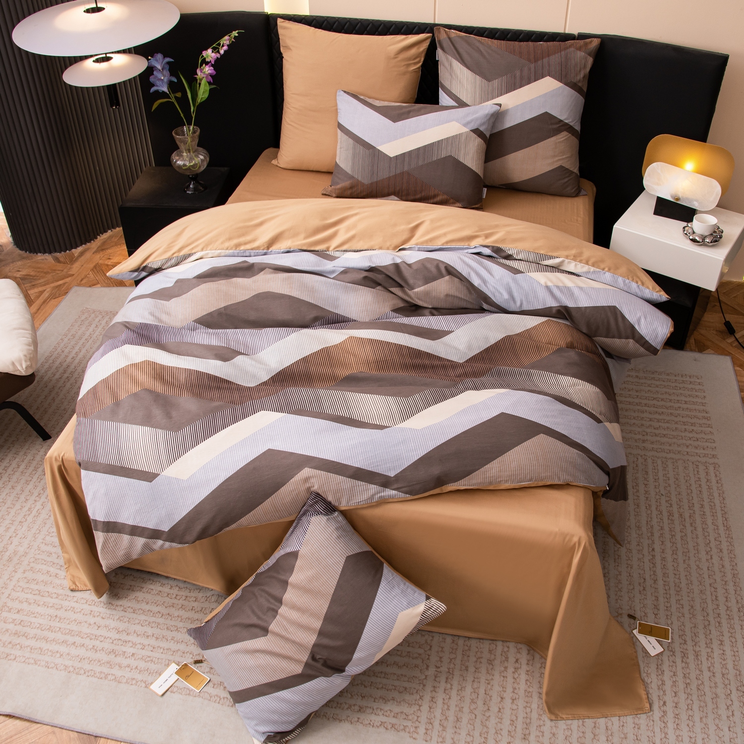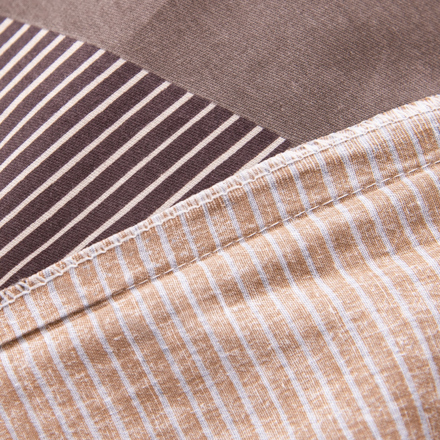 Ткань компаньон: Наволочки с разных сторон разной расцветки, пододеяльник с разных сторон разного цвета, простыня такого же цвета, как низ пододеяльника.