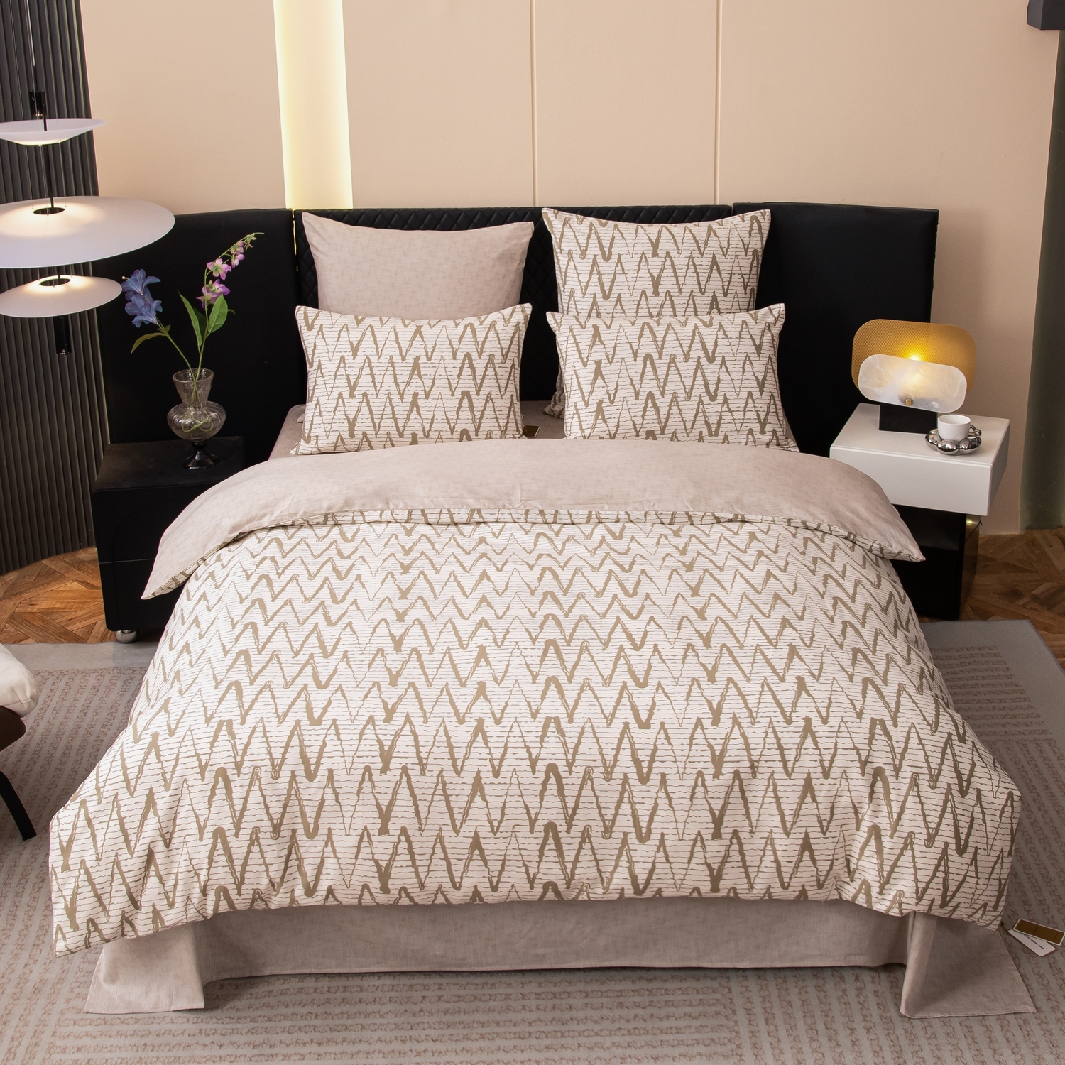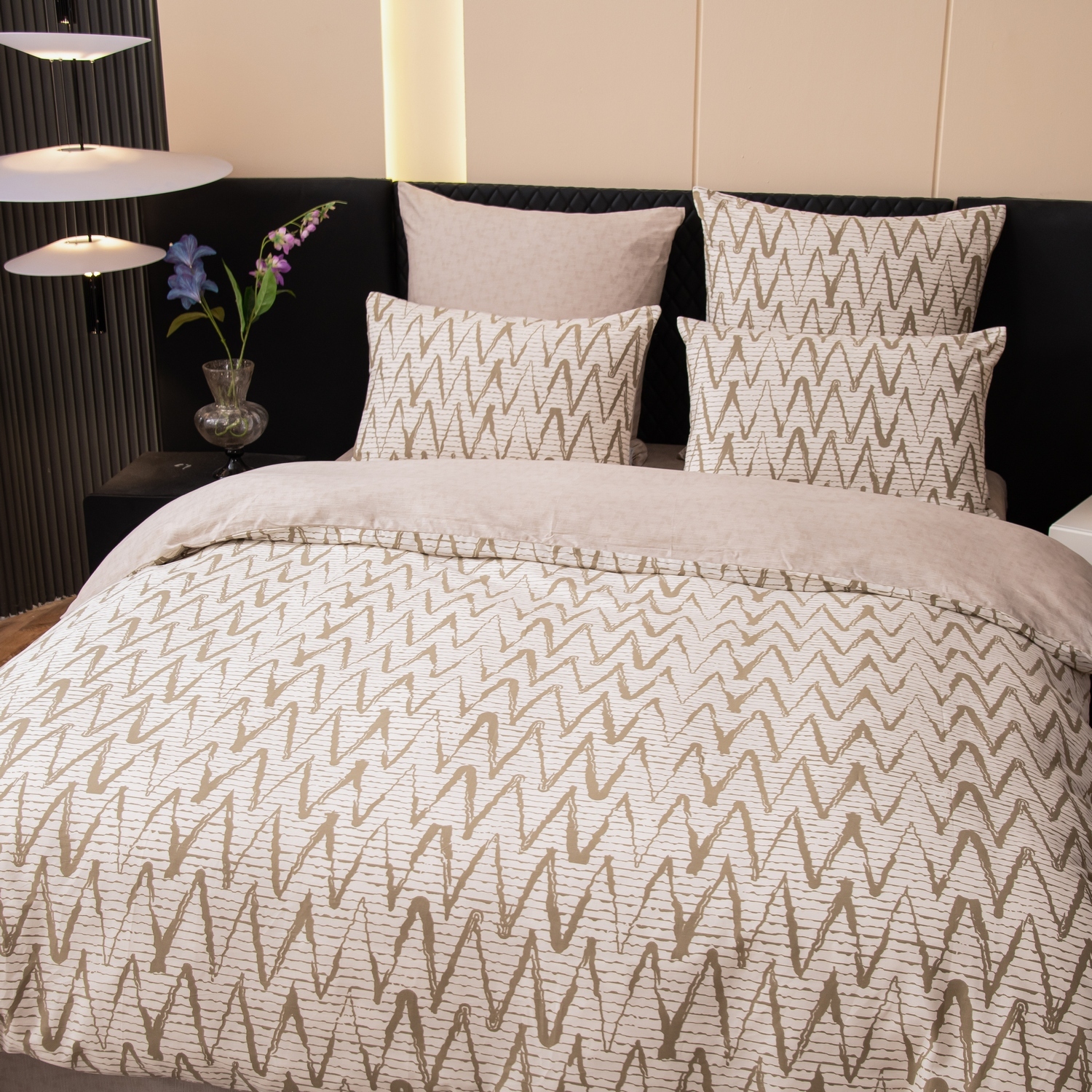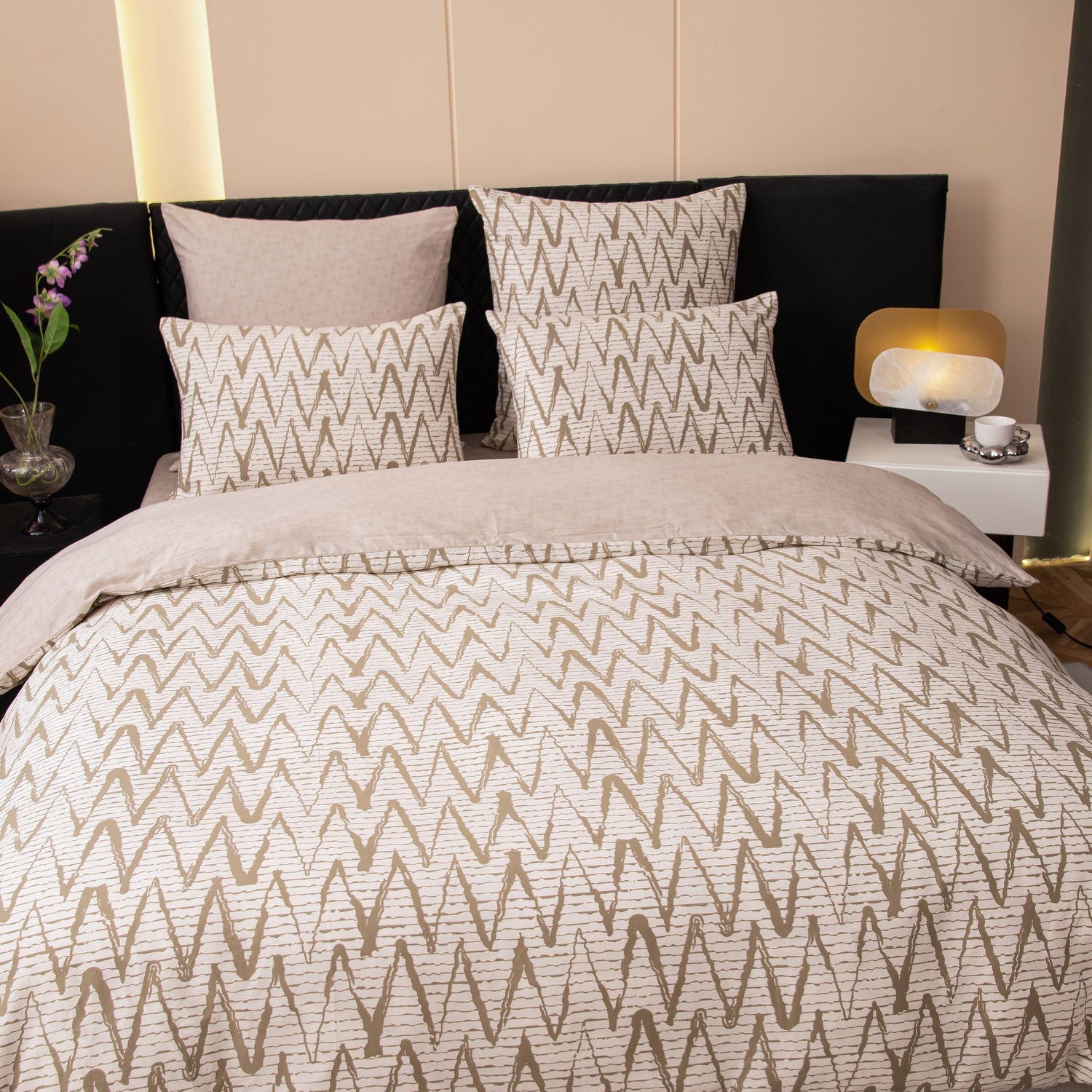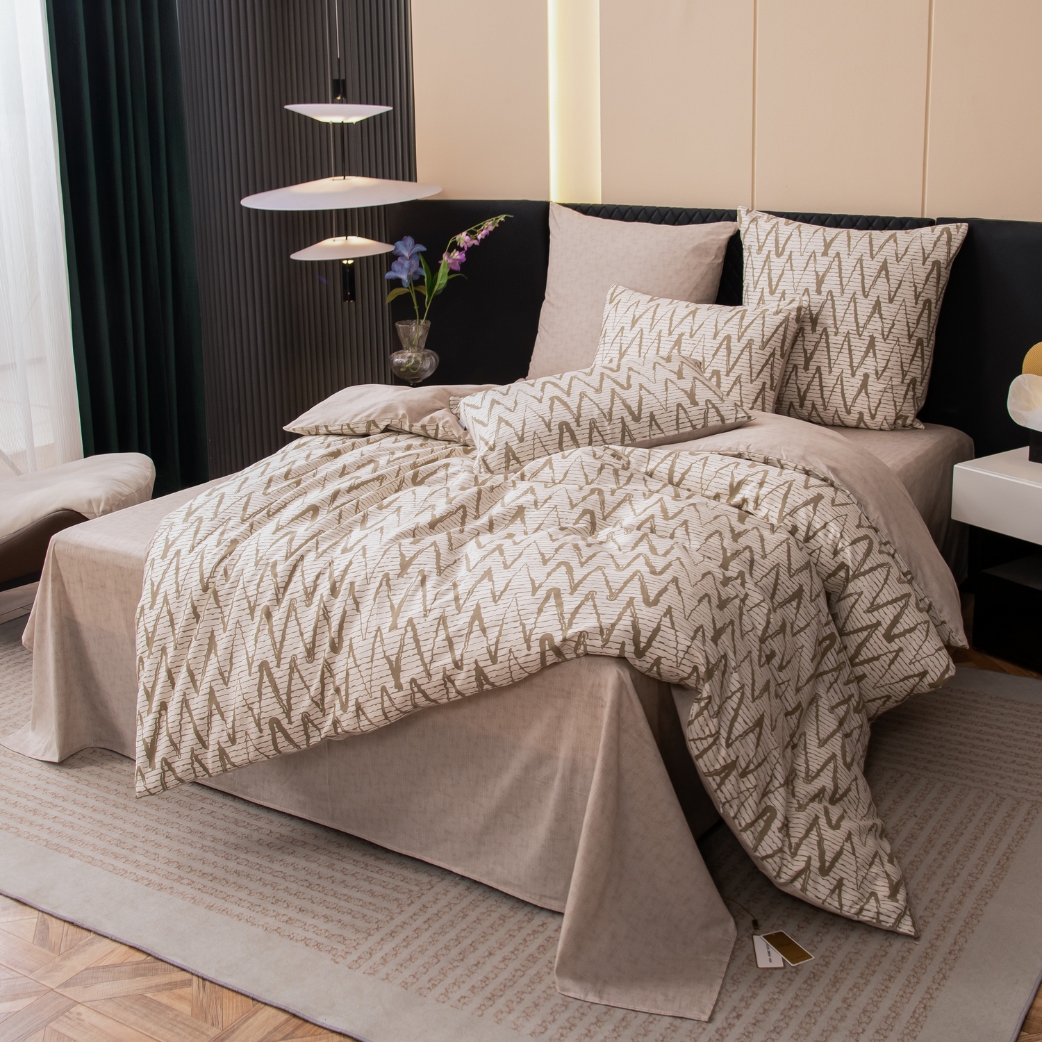 Ткань компаньон: Наволочки с разных сторон разной расцветки, пододеяльник с разных сторон разного цвета, простыня такого же цвета, как низ пододеяльника.