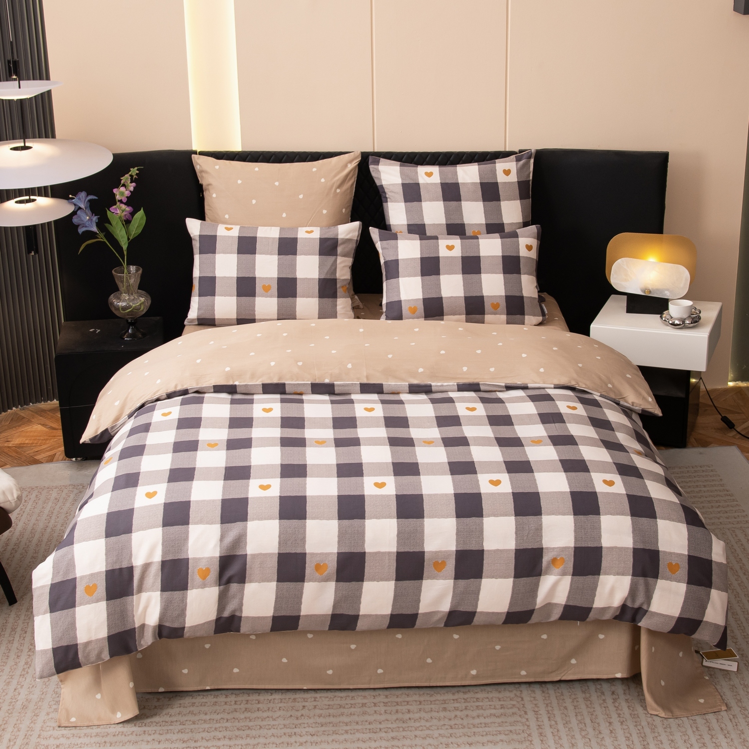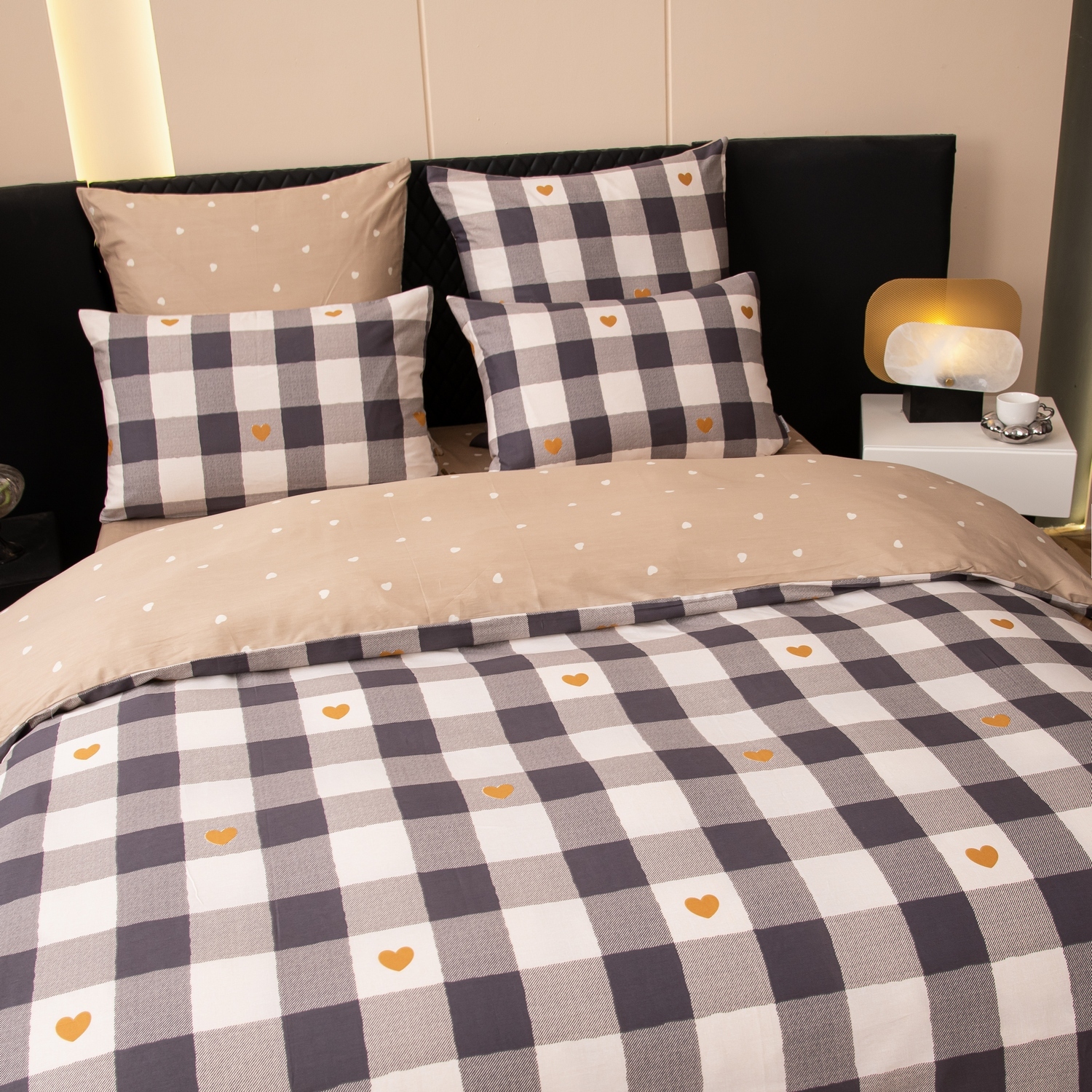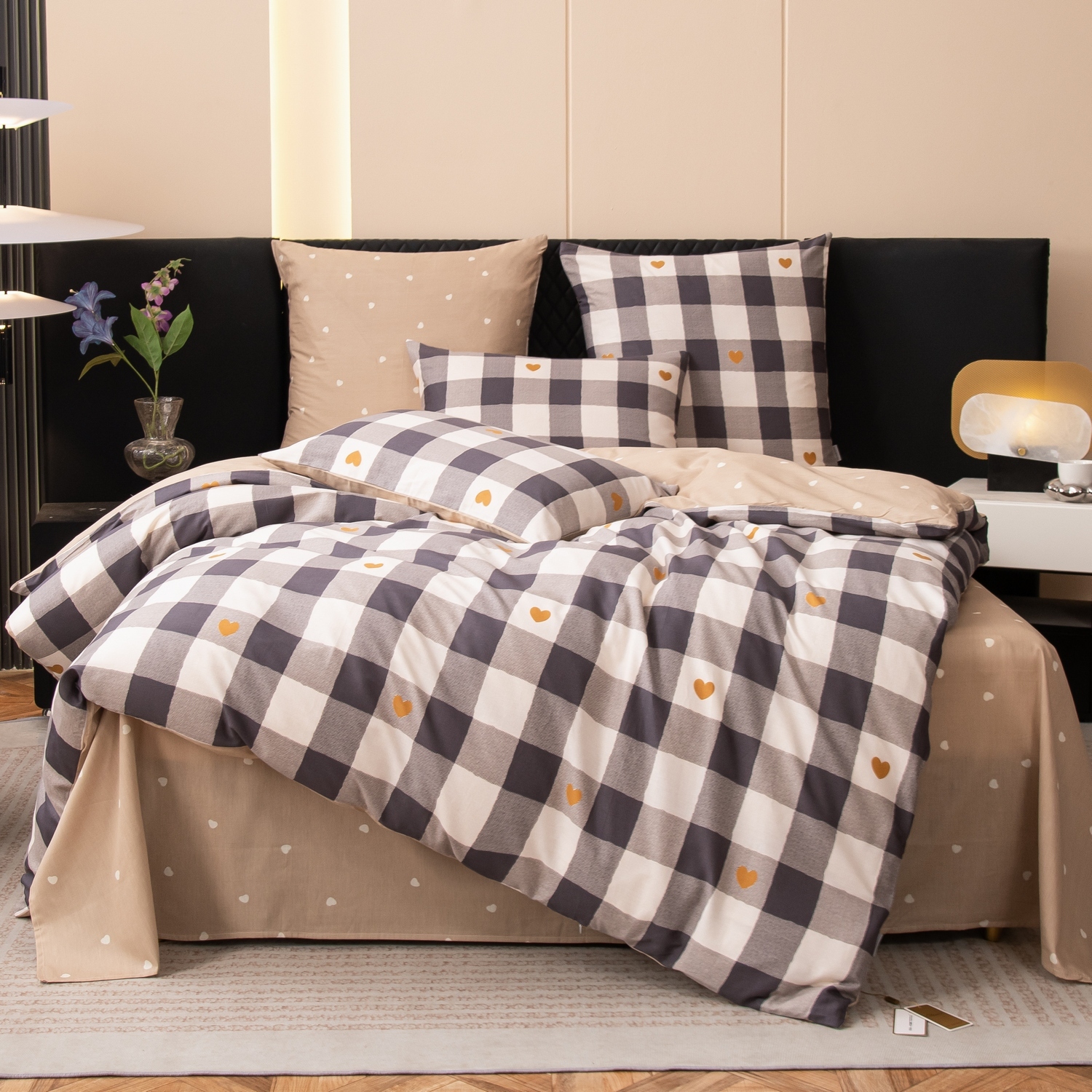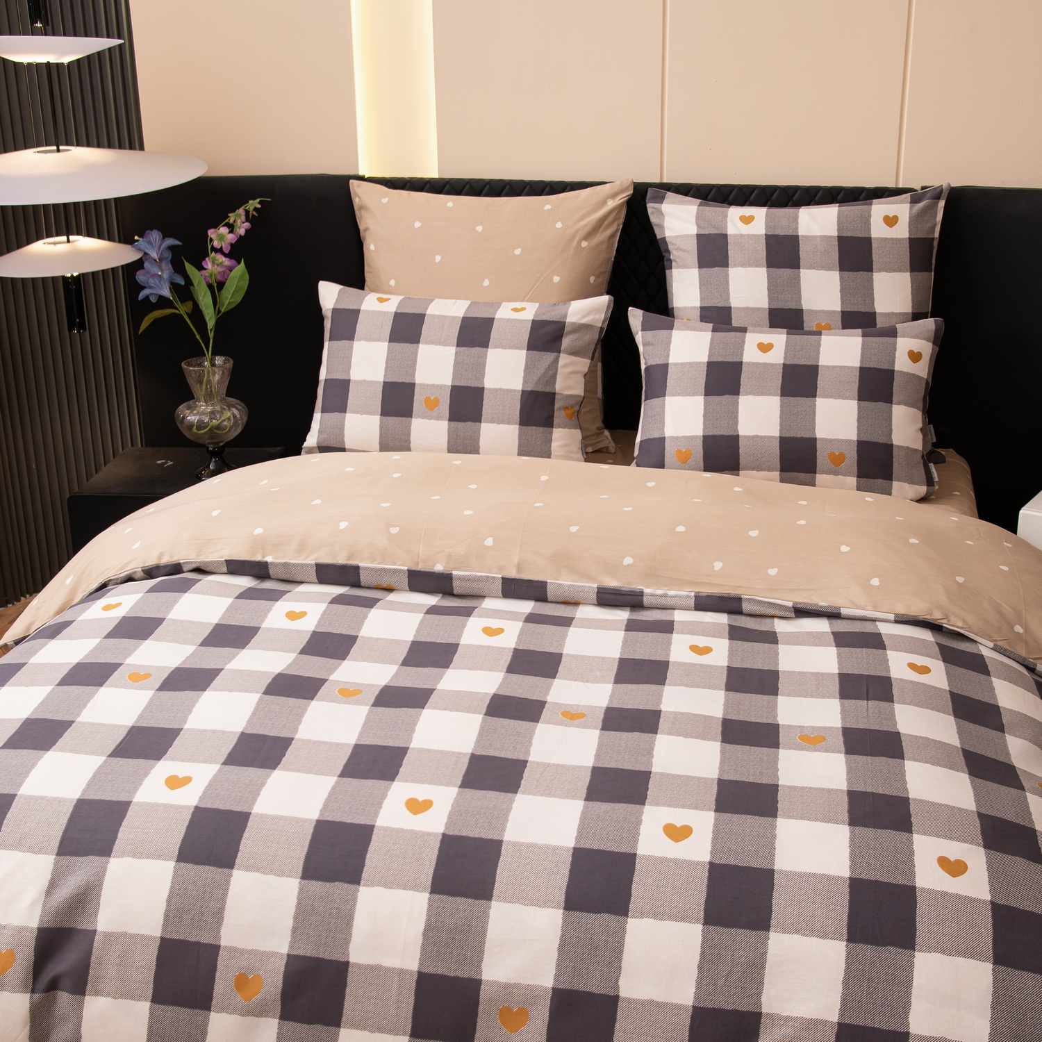 Ткань компаньон: Наволочки с разных сторон разной расцветки, пододеяльник с разных сторон разного цвета, простыня такого же цвета, как низ пододеяльника.