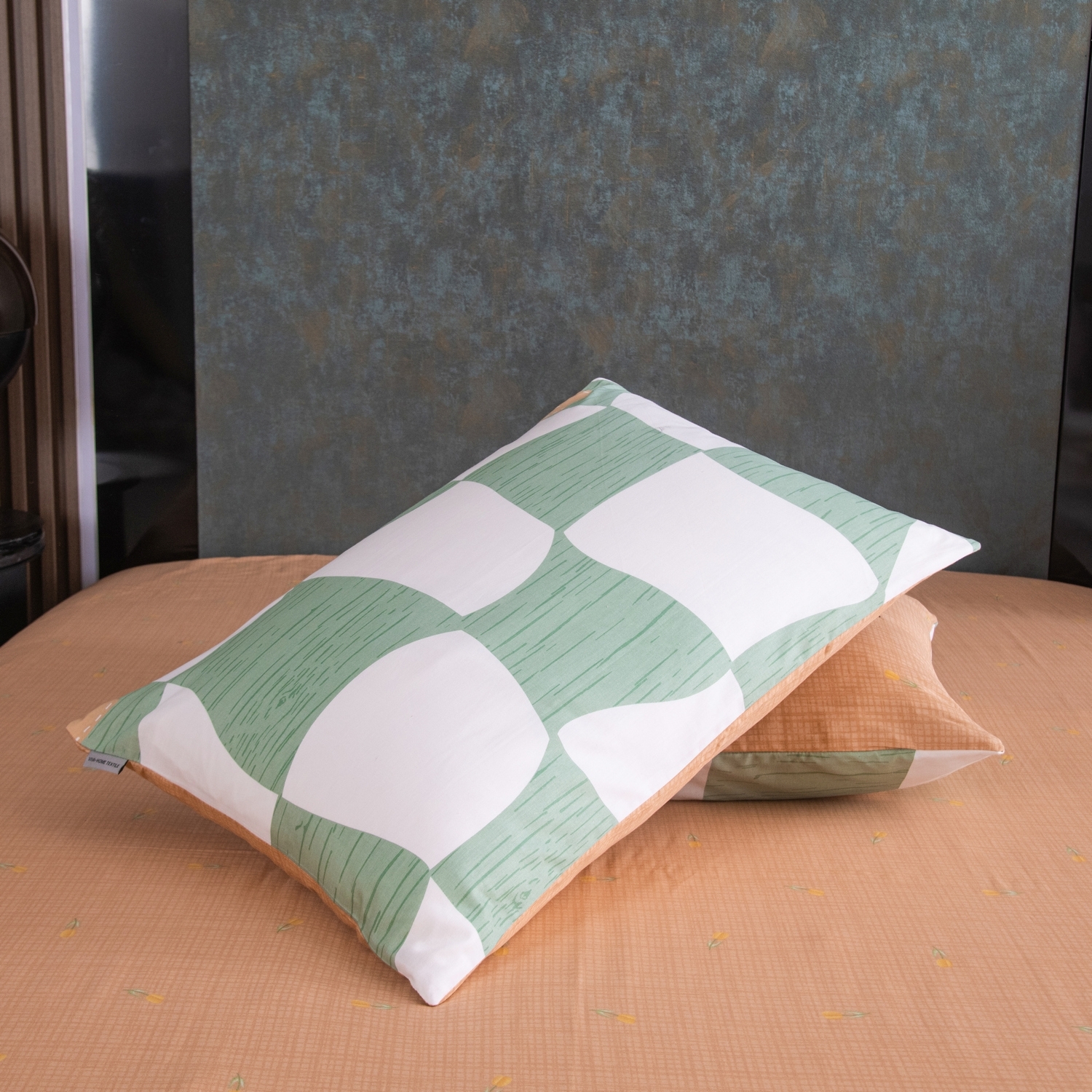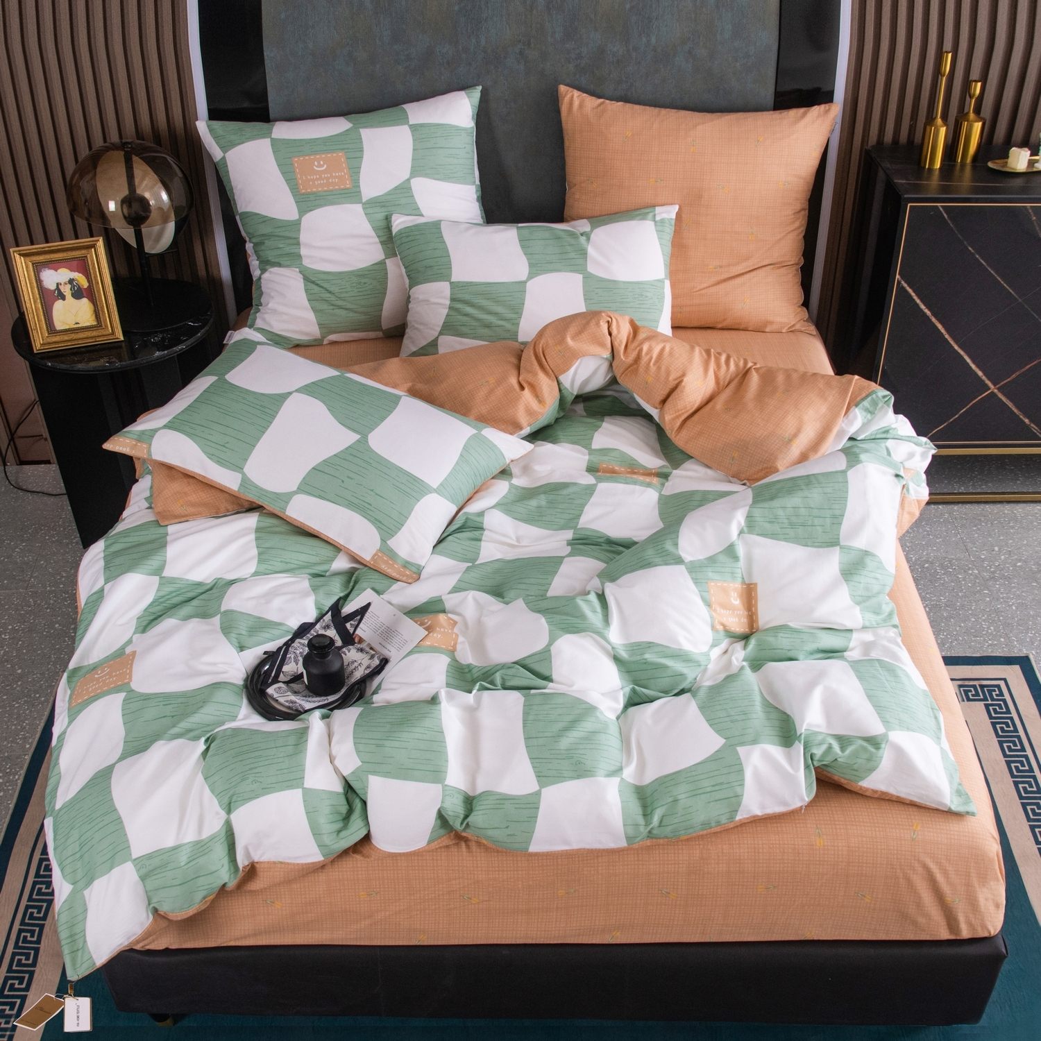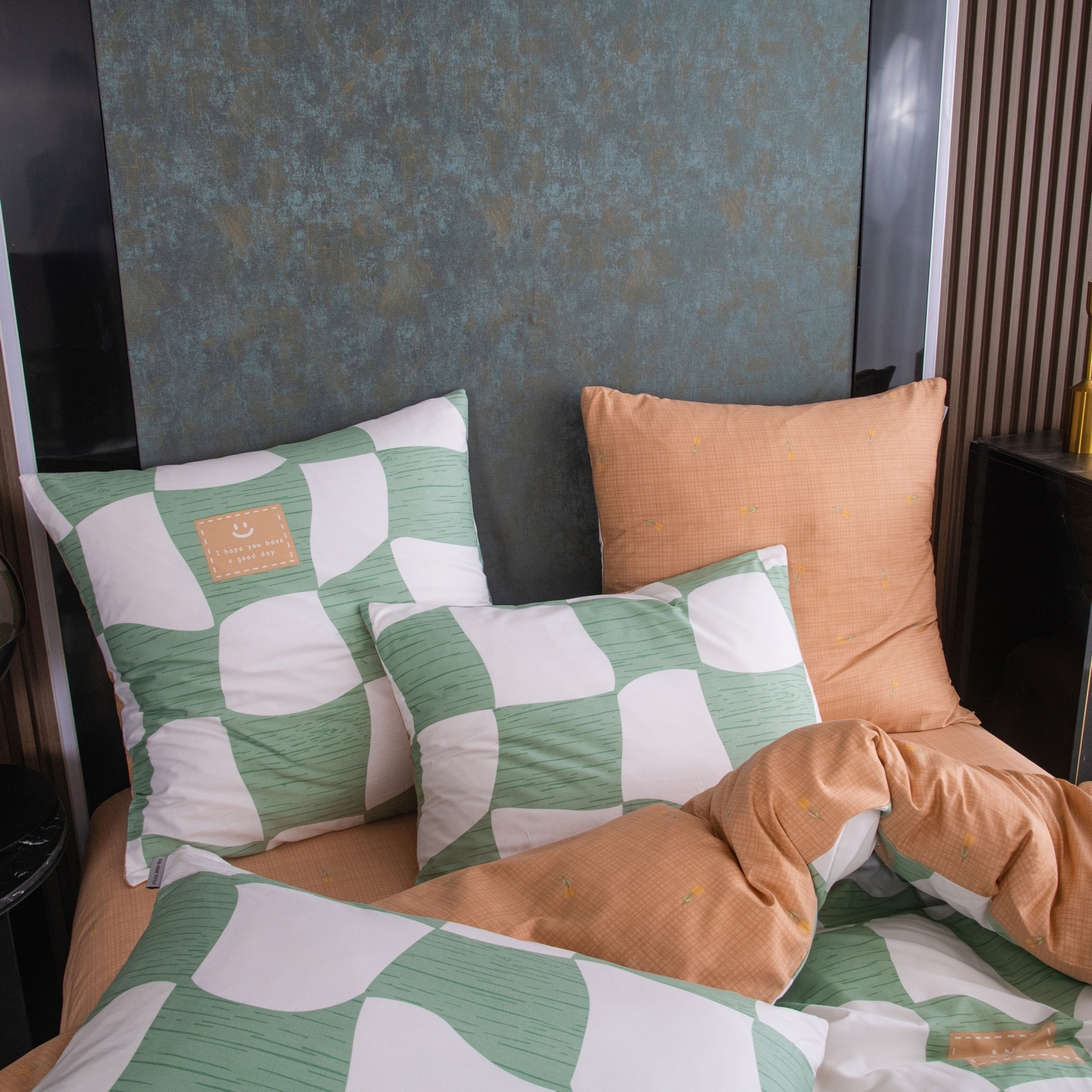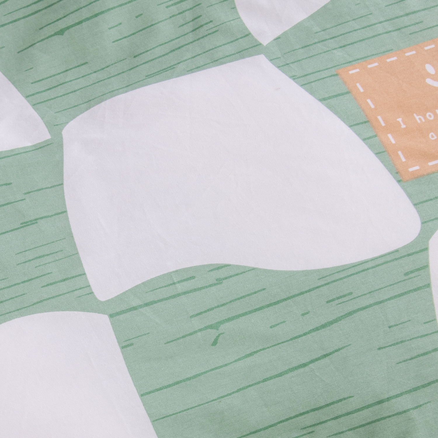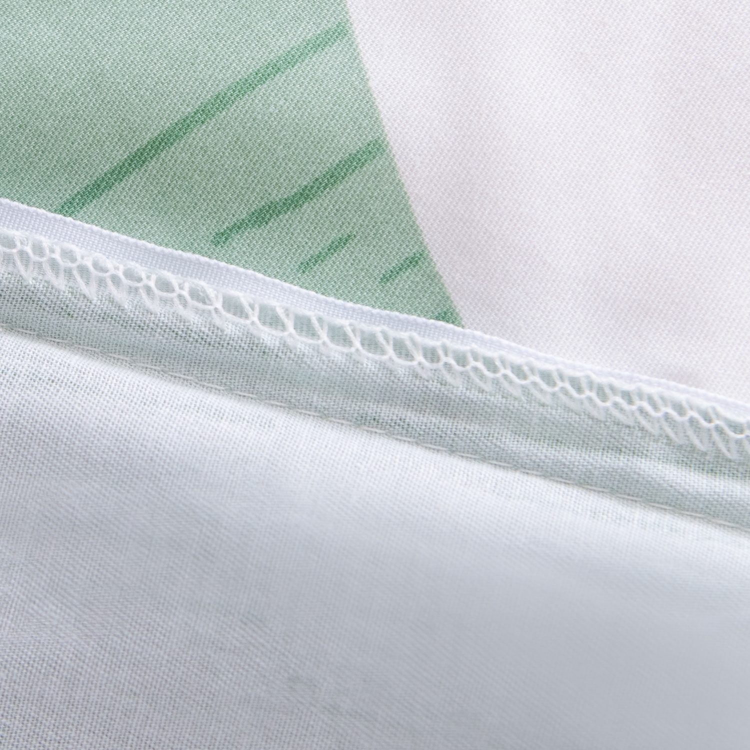 Ткань компаньон: Наволочки с разных сторон разной расцветки, пододеяльник с разных сторон разного цвета, простыня такого же цвета, как низ пододеяльника.