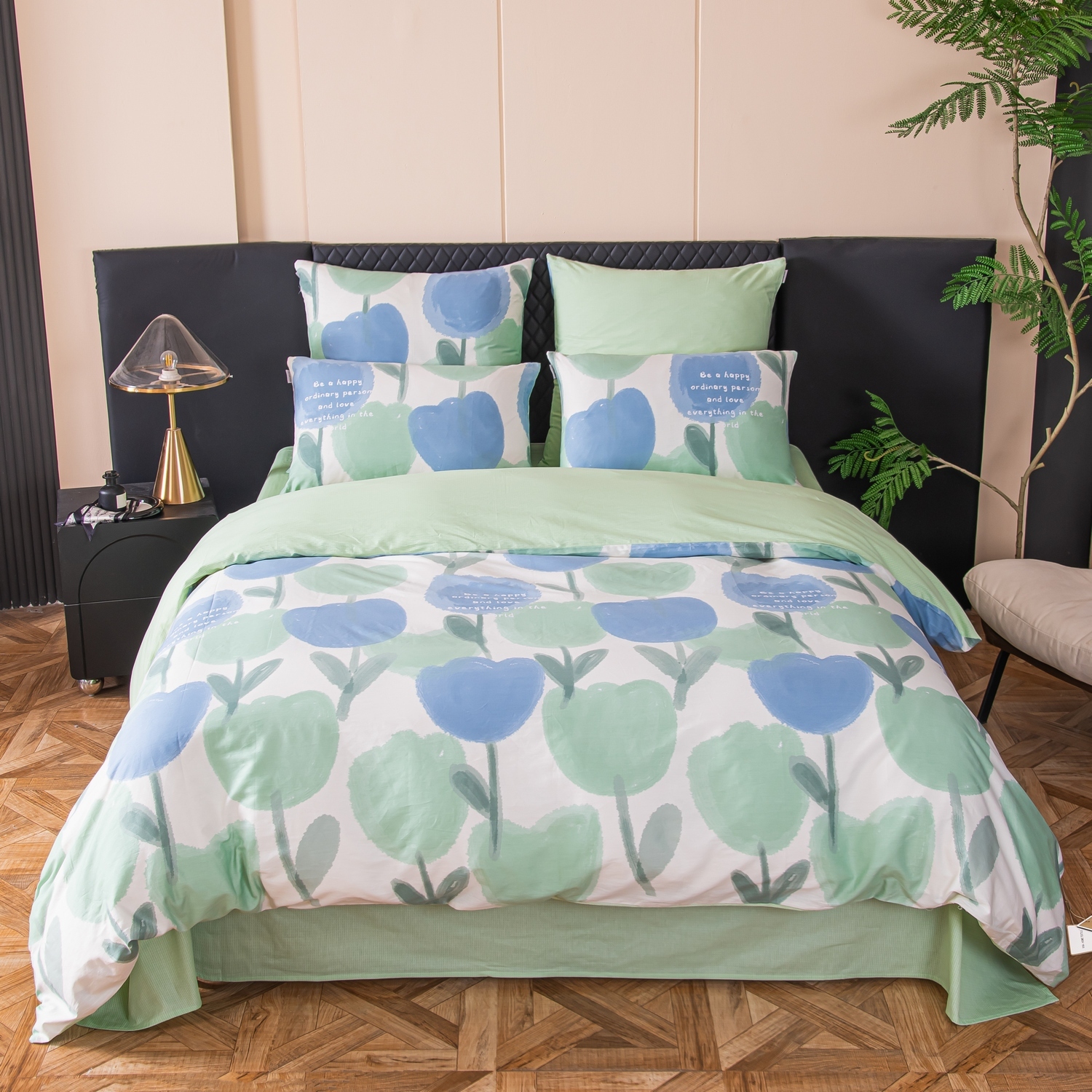 Ткань компаньон: Наволочки с разных сторон разной расцветки, пододеяльник с разных сторон разного цвета, простыня такого же цвета, как низ пододеяльника.