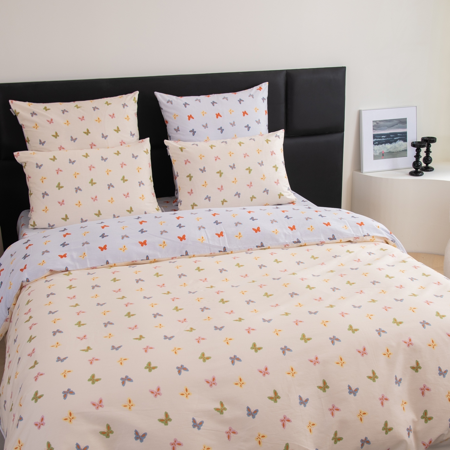 Ткань компаньон: Наволочки с разных сторон разной расцветки, пододеяльник с разных сторон разного цвета, простыня такого же цвета, как низ пододеяльника.