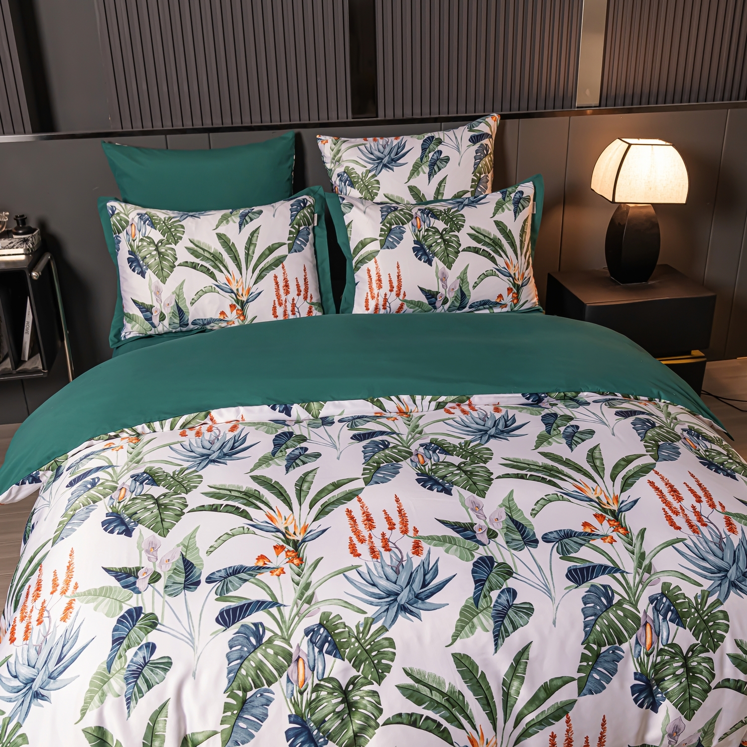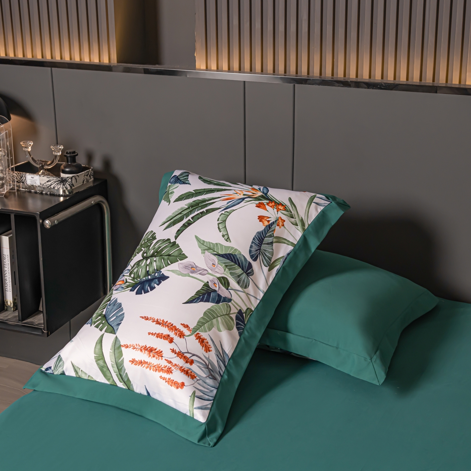 Ткань компаньон: Верх пододеяльника - мерсеризованный сатин, низ пододеяльника - сатин. Наволочки 50*70 см и 70*70 см с разных сторон разной расцветки. Пододеяльник с разных сторон разного цвета. Простыня однотонная такого же цвета, как низ пододеяльника.