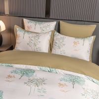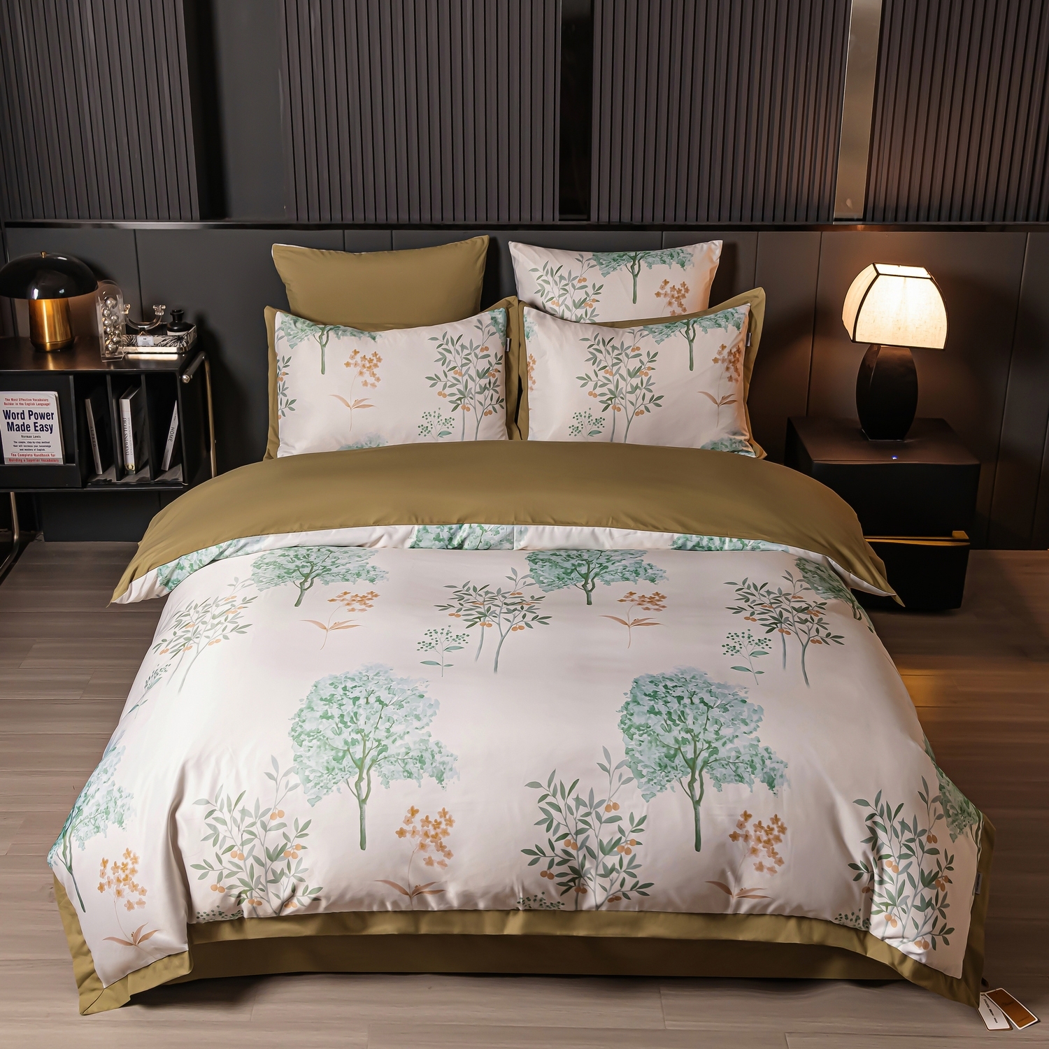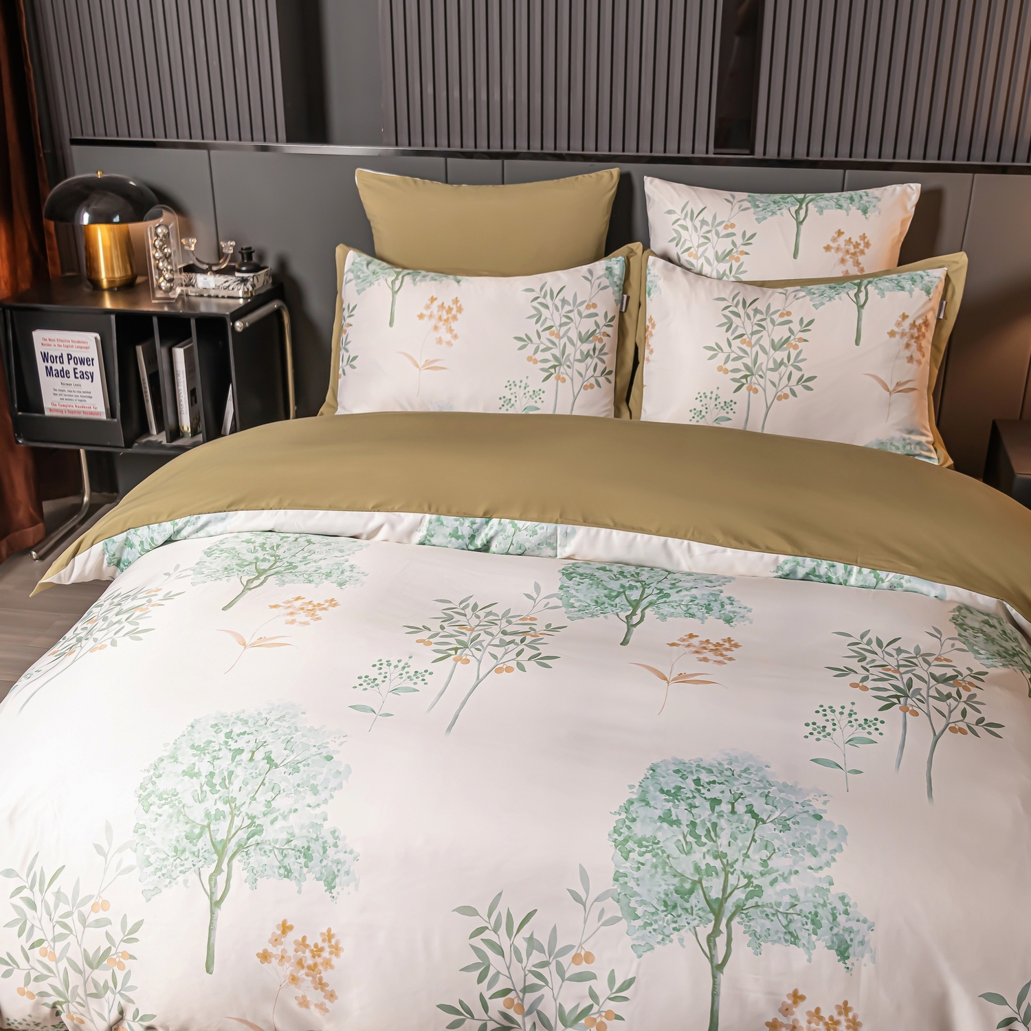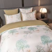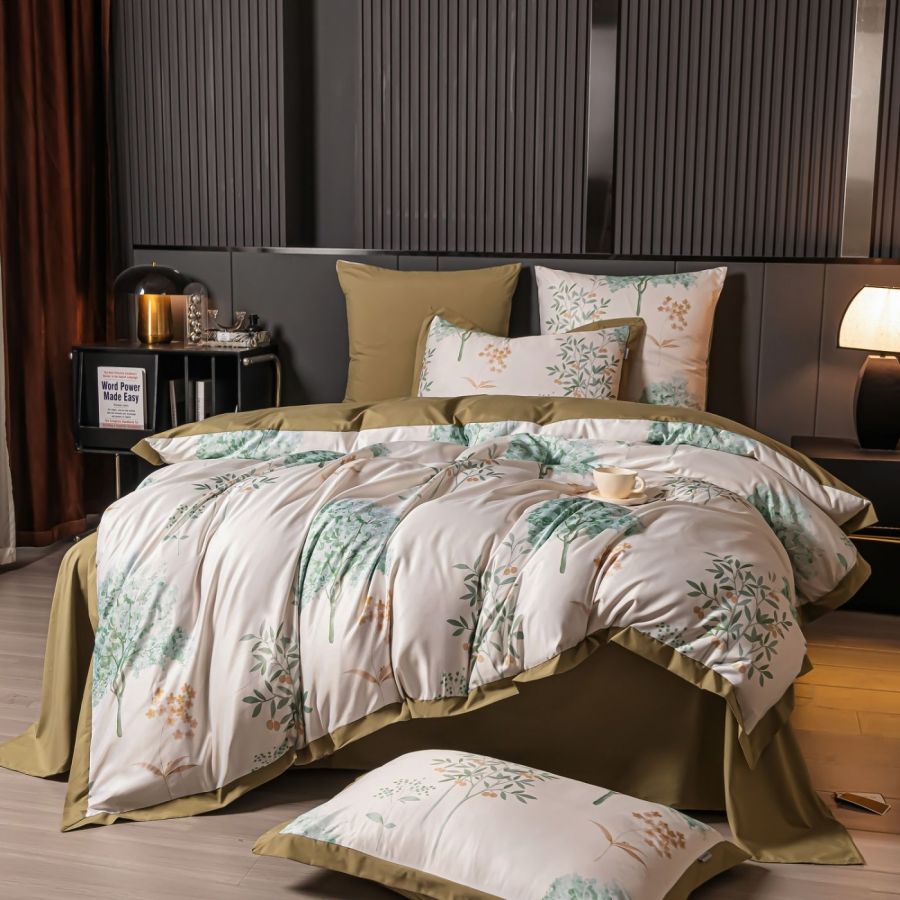 Ткань компаньон: Верх пододеяльника - мерсеризованный сатин, низ пододеяльника - сатин. Наволочки 50*70 см и 70*70 см с разных сторон разной расцветки. Пододеяльник с разных сторон разного цвета. Простыня однотонная такого же цвета, как низ пододеяльника.