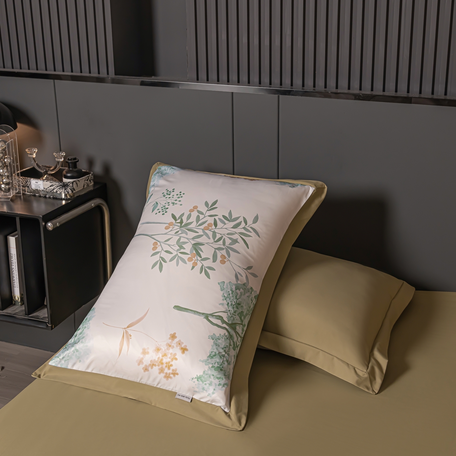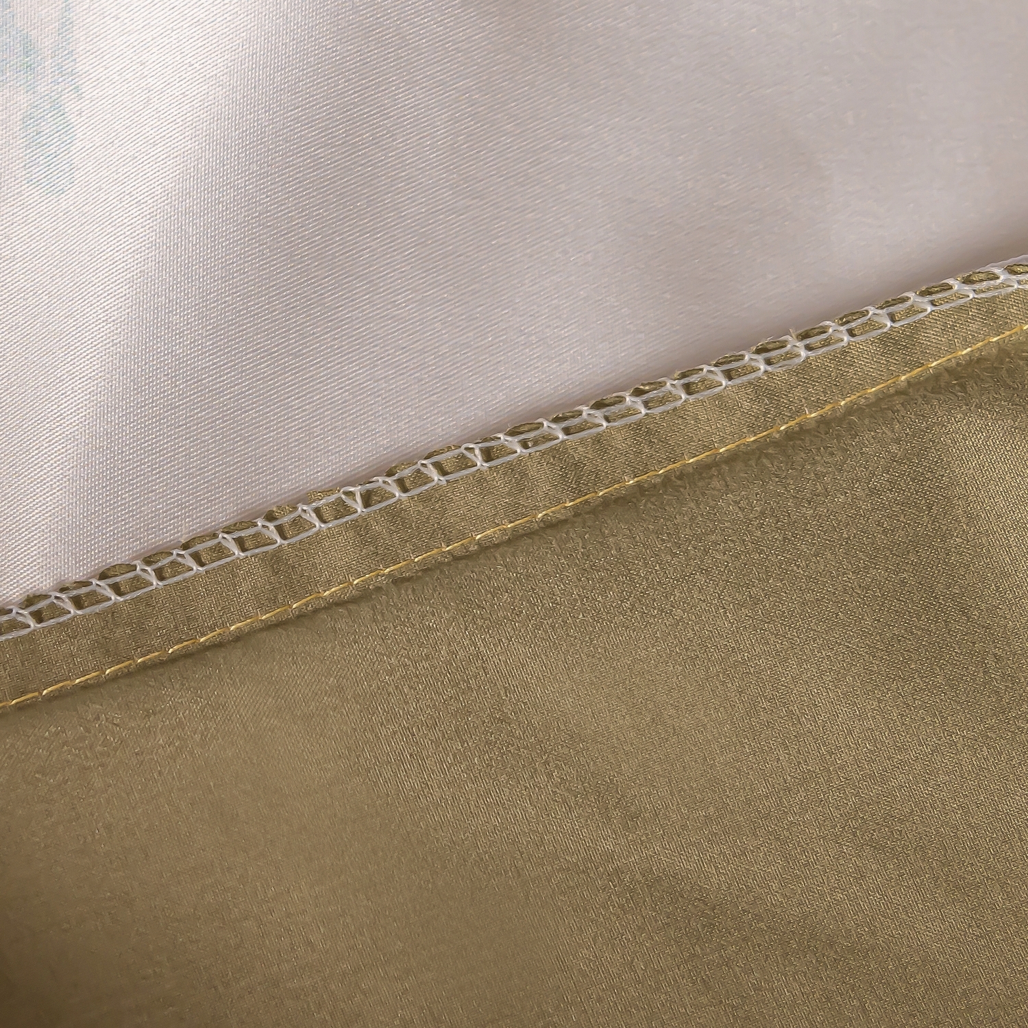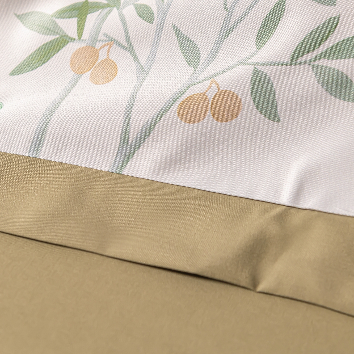 Ткань компаньон: Верх пододеяльника - мерсеризованный сатин, низ пододеяльника - сатин. Наволочки 50*70 см и 70*70 см с разных сторон разной расцветки. Пододеяльник с разных сторон разного цвета. Простыня однотонная такого же цвета, как низ пододеяльника.