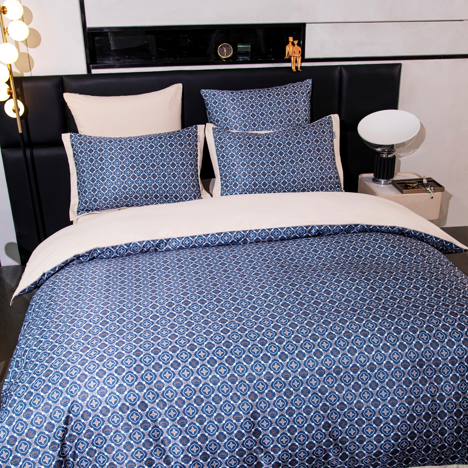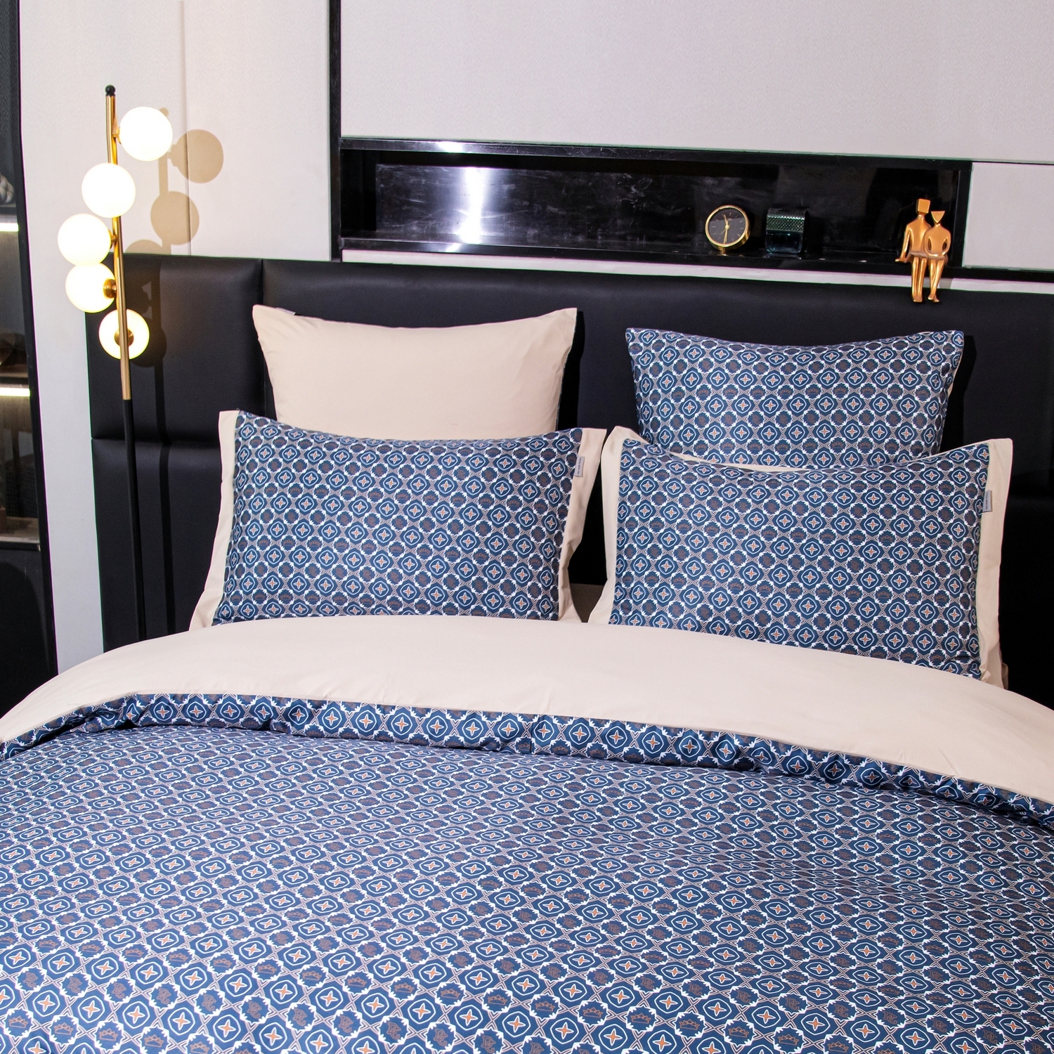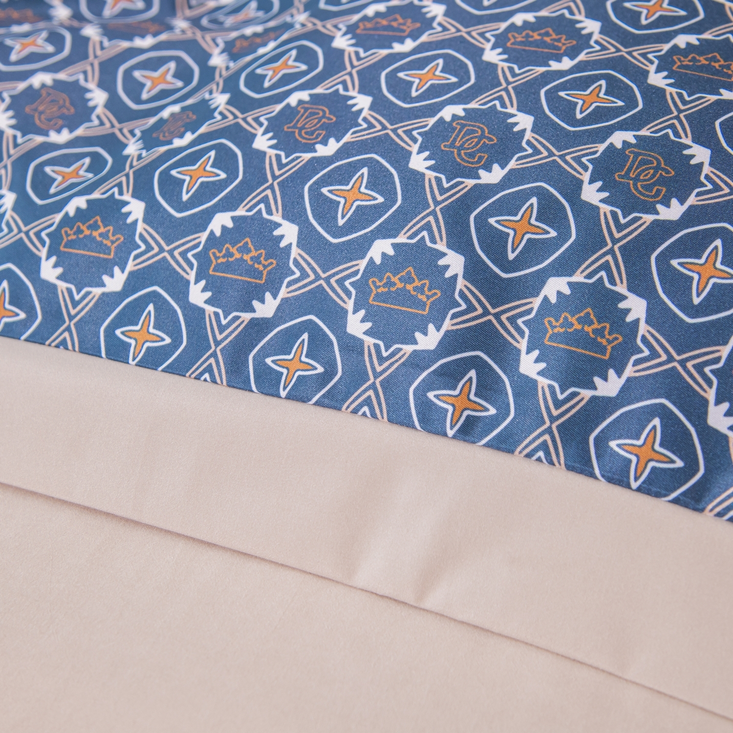 Ткань компаньон: Верх пододеяльника - мерсеризованный сатин, низ пододеяльника - сатин. Наволочки 50*70 см и 70*70 см с разных сторон разной расцветки. Пододеяльник с разных сторон разного цвета. Простыня однотонная такого же цвета, как низ пододеяльника.