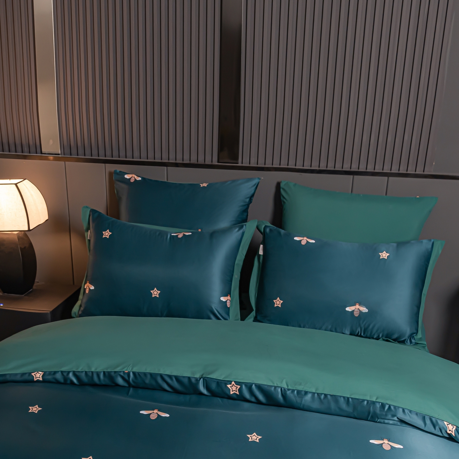 Ткань компаньон: Верх пододеяльника - мерсеризованный сатин, низ пододеяльника - сатин. Наволочки 50*70 см и 70*70 см с разных сторон разной расцветки. Пододеяльник с разных сторон разного цвета. Простыня однотонная такого же цвета, как низ пододеяльника.
