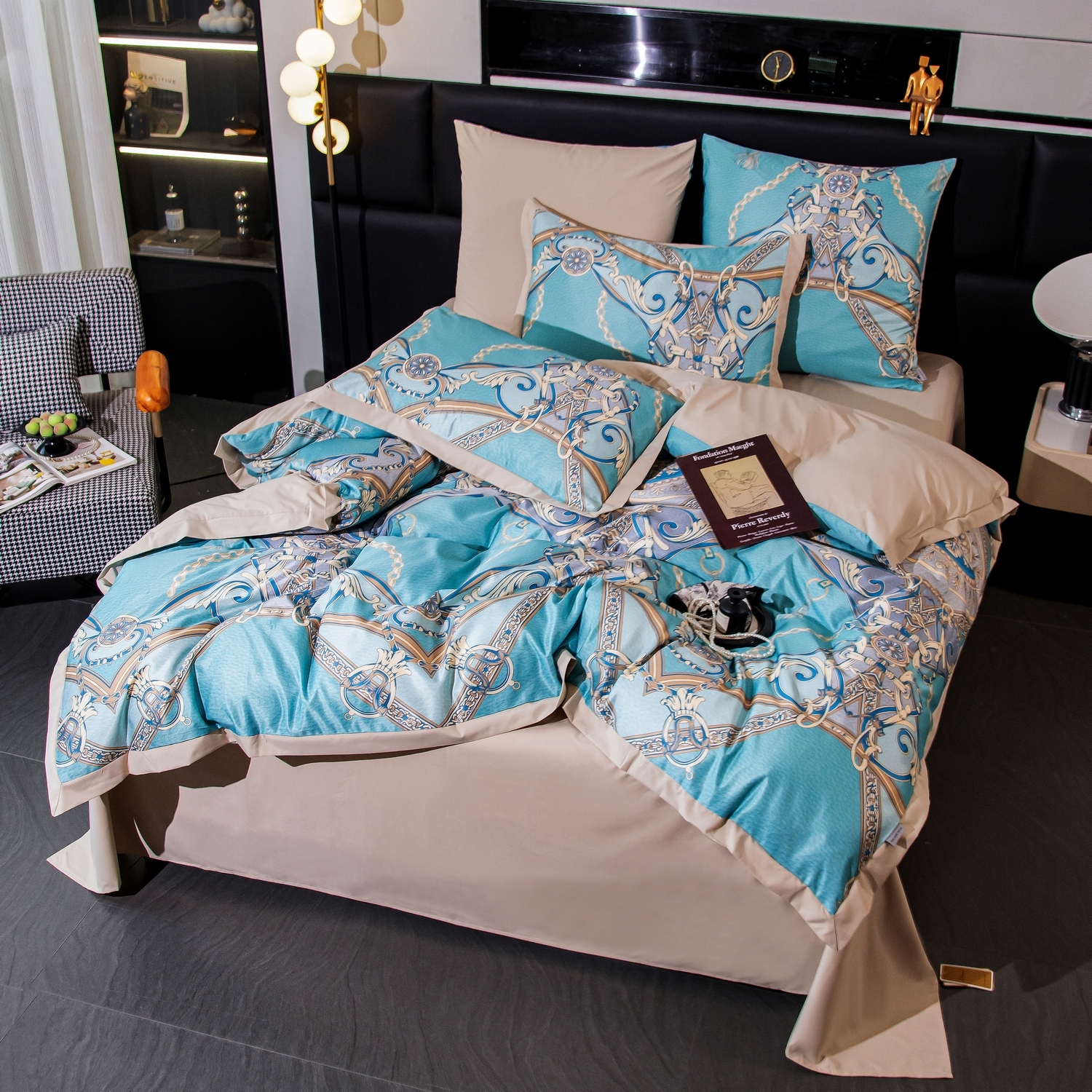 Ткань компаньон: Верх пододеяльника - мерсеризованный сатин, низ пододеяльника - сатин. Наволочки 50*70 см и 70*70 см с разных сторон разной расцветки. Пододеяльник с разных сторон разного цвета. Простыня однотонная такого же цвета, как низ пододеяльника.