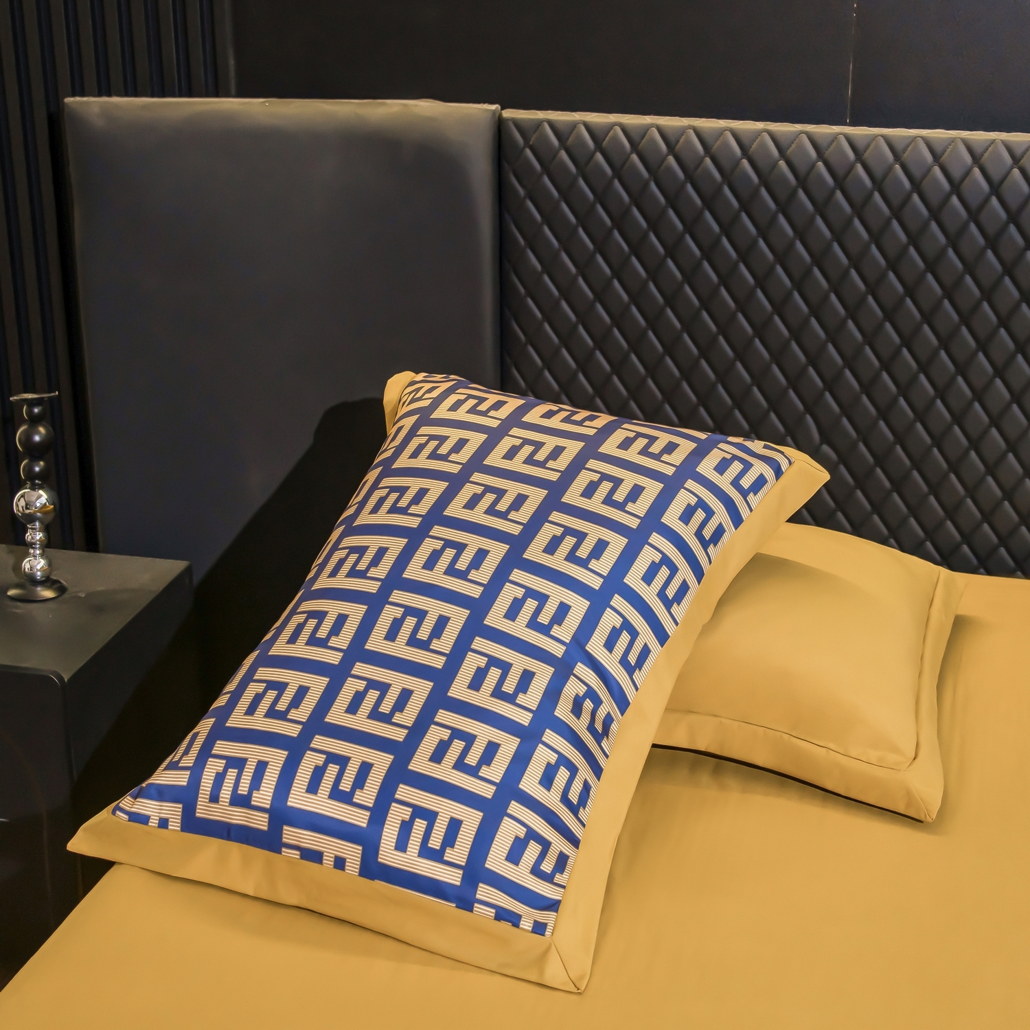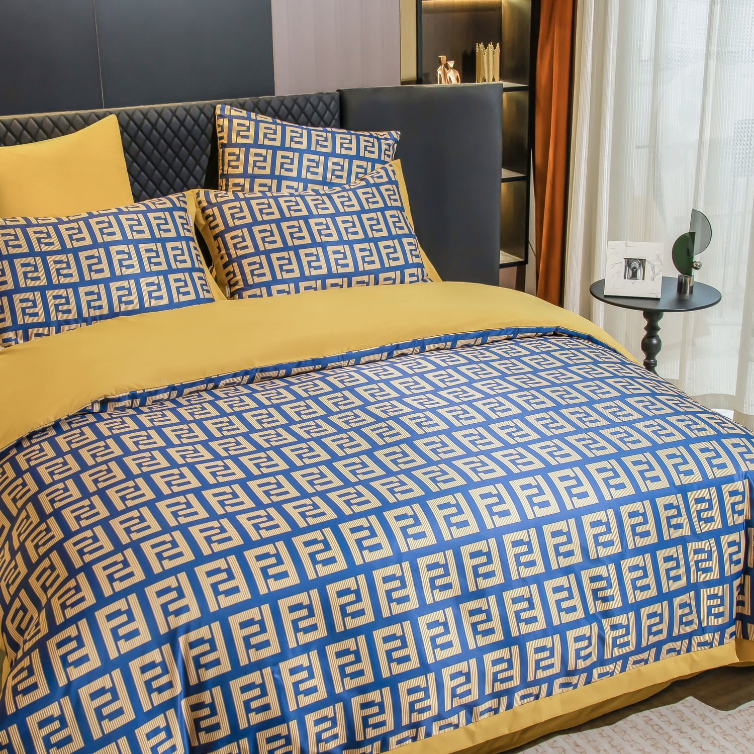 Ткань компаньон: Верх пододеяльника - мерсеризованный сатин, низ пододеяльника - сатин. Наволочки 50*70 см и 70*70 см с разных сторон разной расцветки. Пододеяльник с разных сторон разного цвета. Простыня однотонная такого же цвета, как низ пододеяльника.