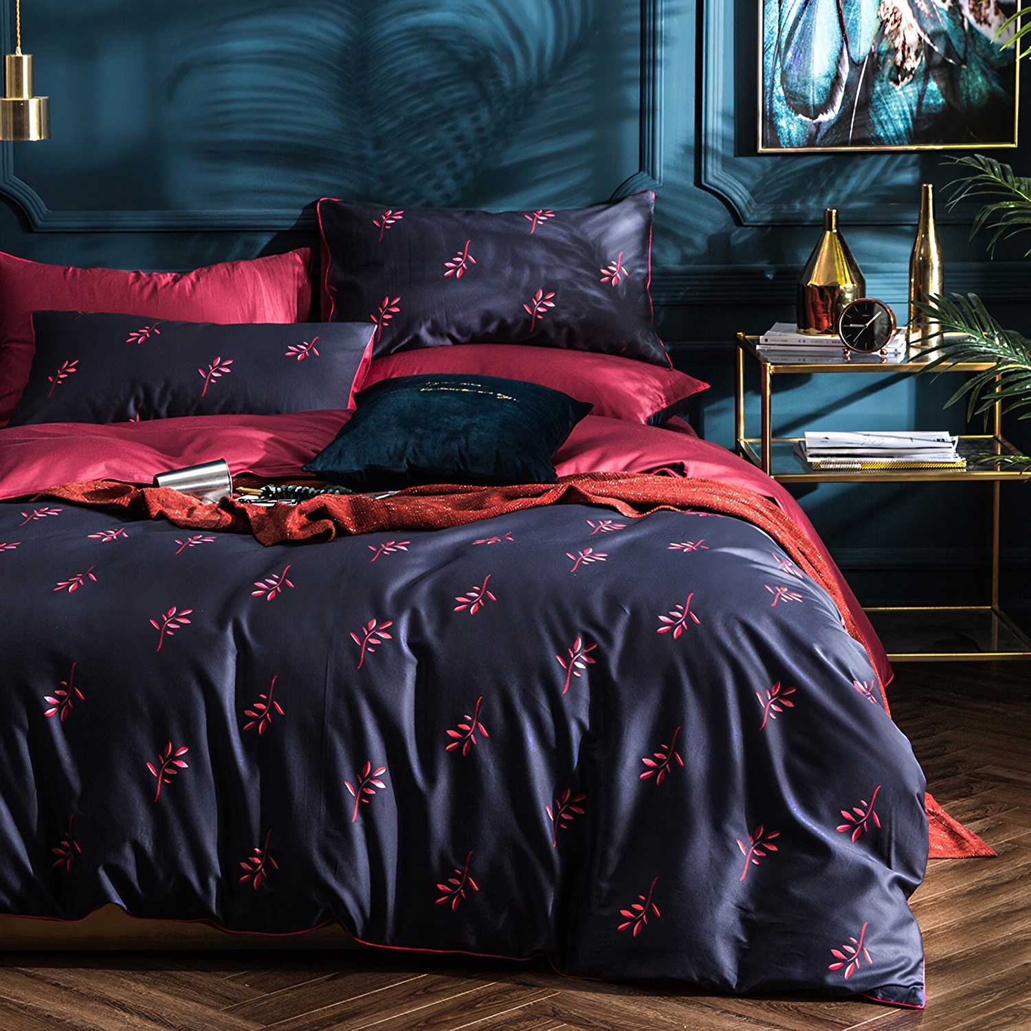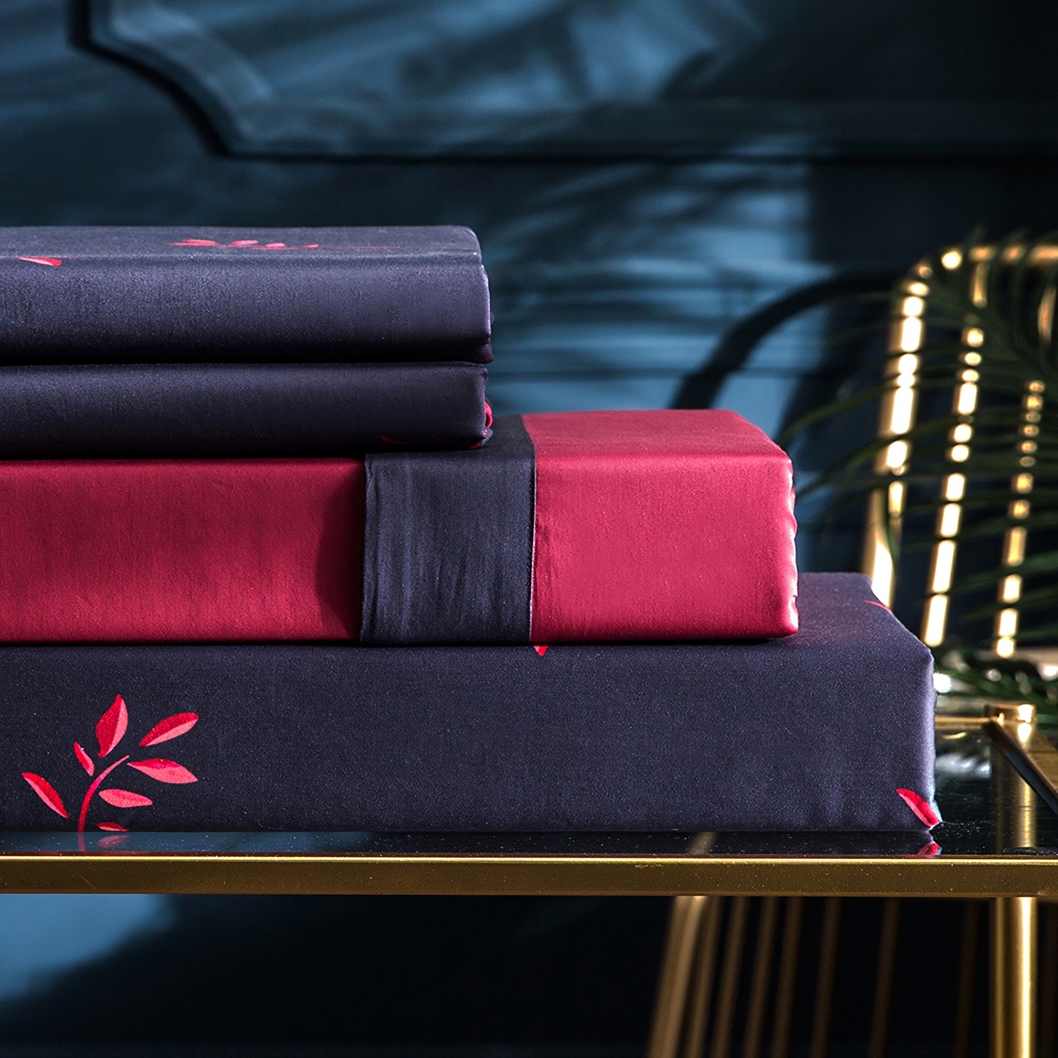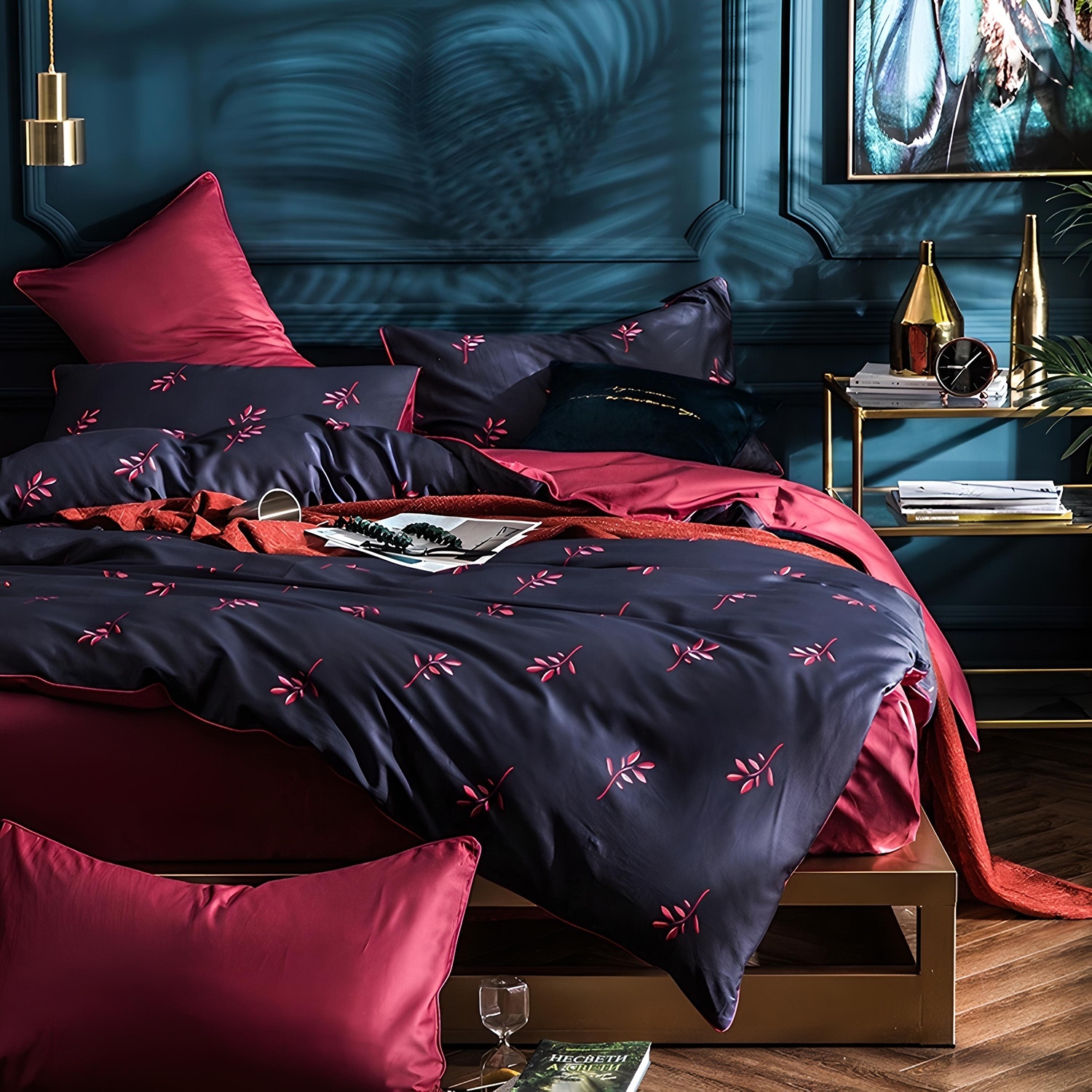 Ткань компаньон: Наволочки 50*70 с разных сторон разной расцветки, наволочки 70*70 однотонные в цвет простыни, пододеяльник с разных сторон разного цвета, простыня однотонная такого же цвета, как низ пододеяльника.