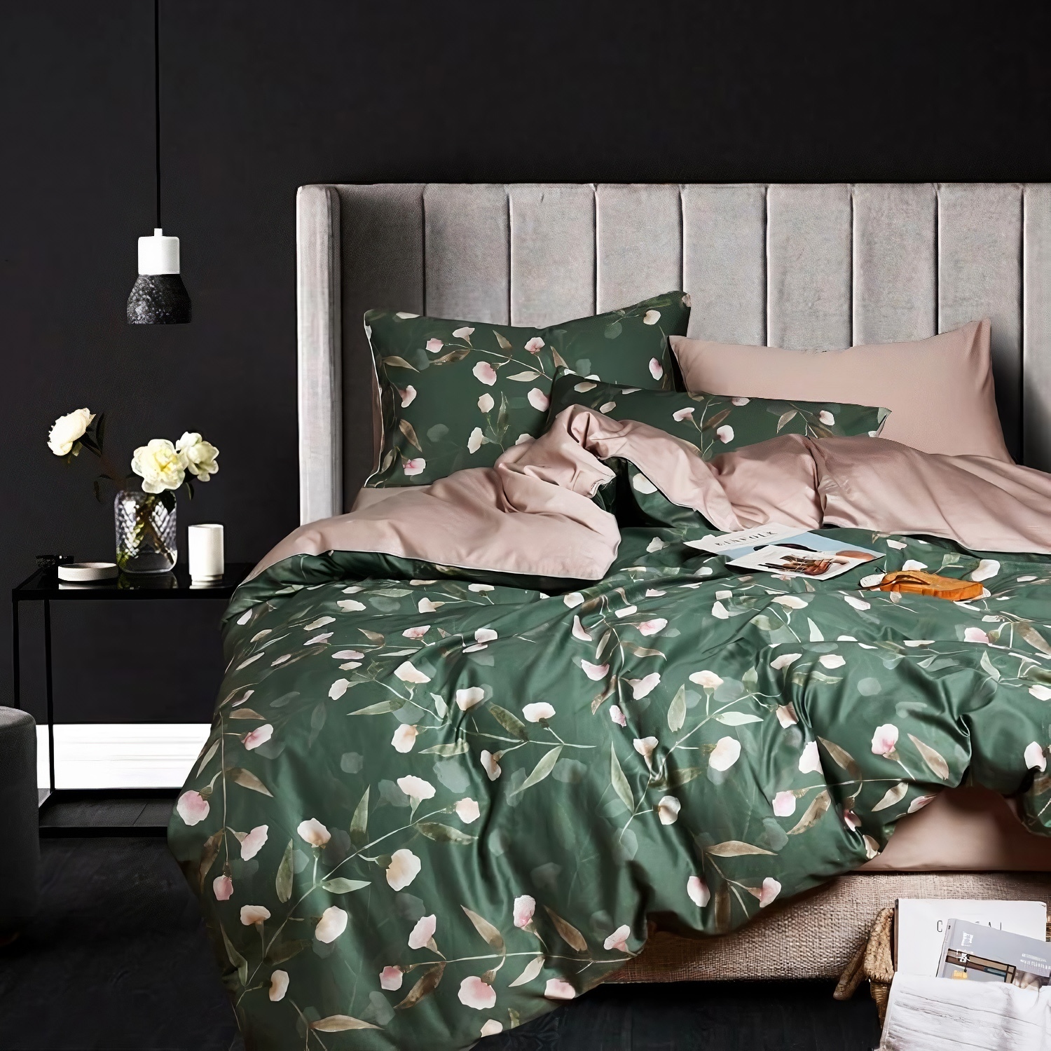 Ткань компаньон: Наволочки 50*70 с разных сторон разной расцветки, наволочки 70*70 однотонные в цвет простыни, пододеяльник с разных сторон разного цвета, простыня однотонная такого же цвета, как низ пододеяльника.