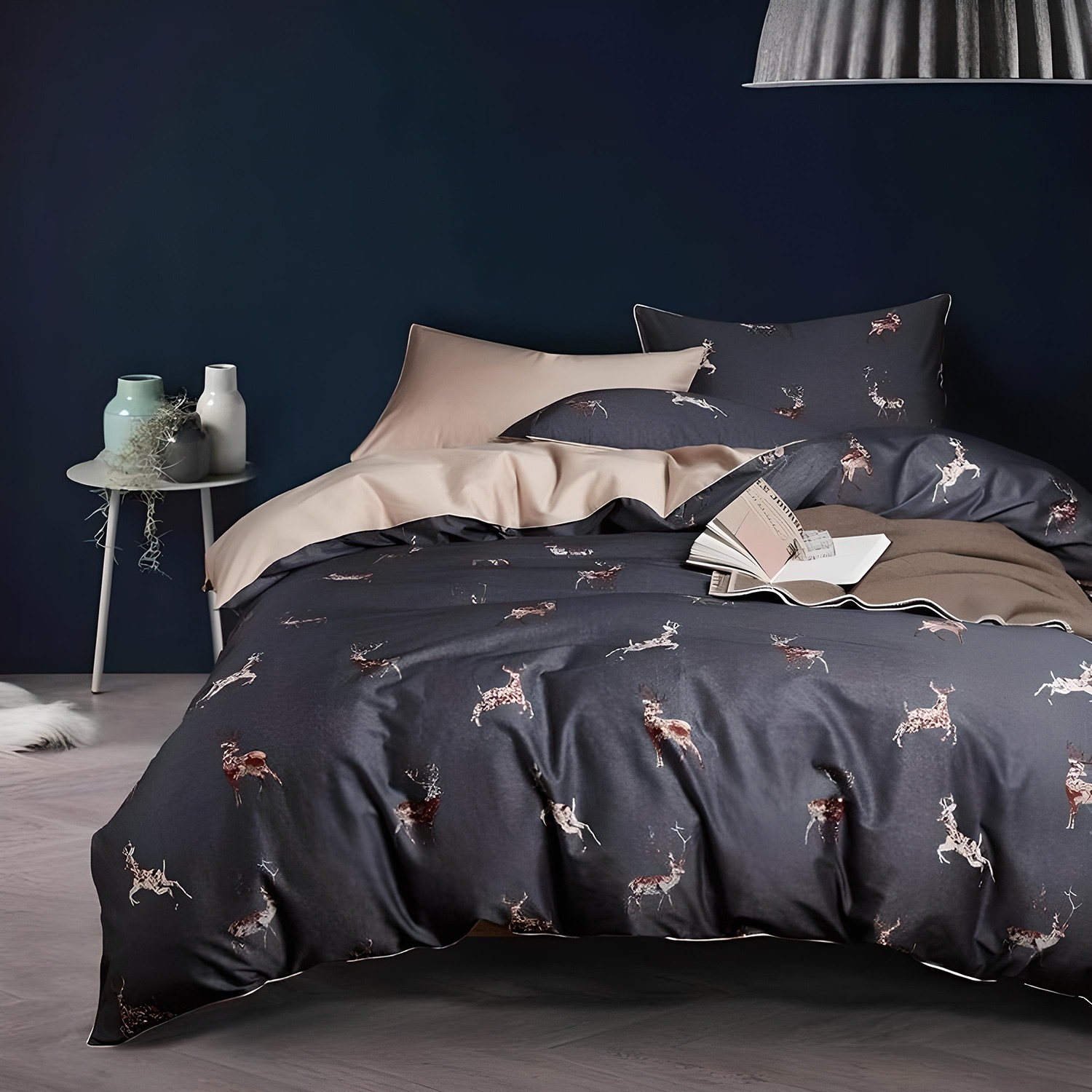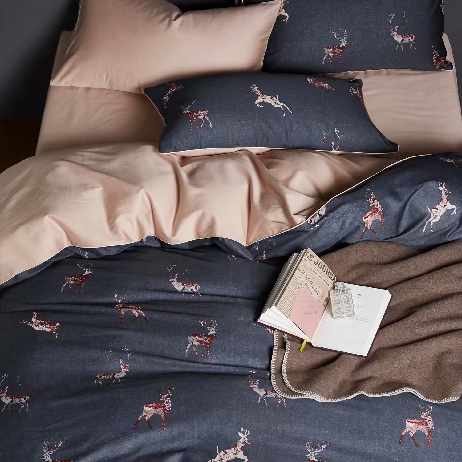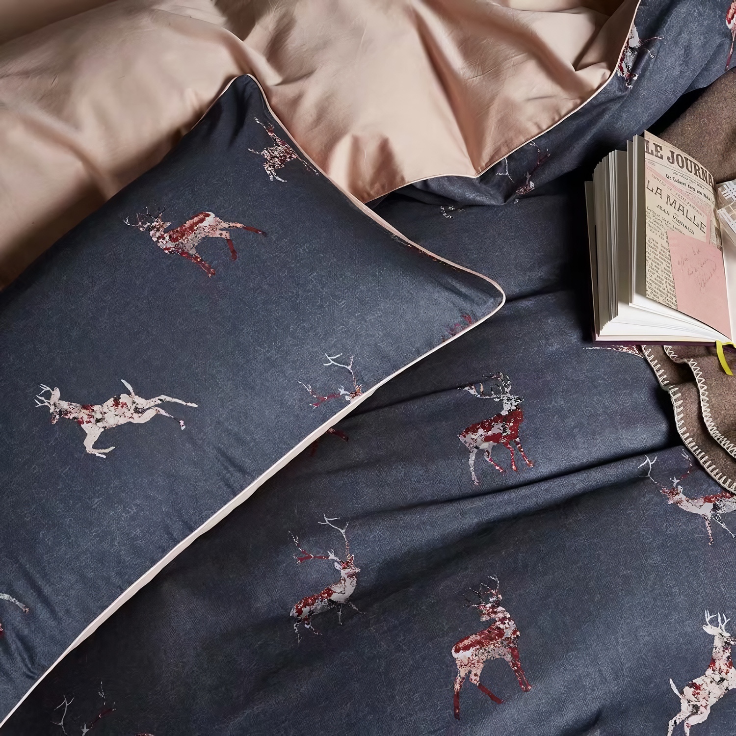 Ткань компаньон: Наволочки 50*70 с разных сторон разной расцветки, наволочки 70*70 однотонные в цвет простыни, пододеяльник с разных сторон разного цвета, простыня однотонная такого же цвета, как низ пододеяльника.
