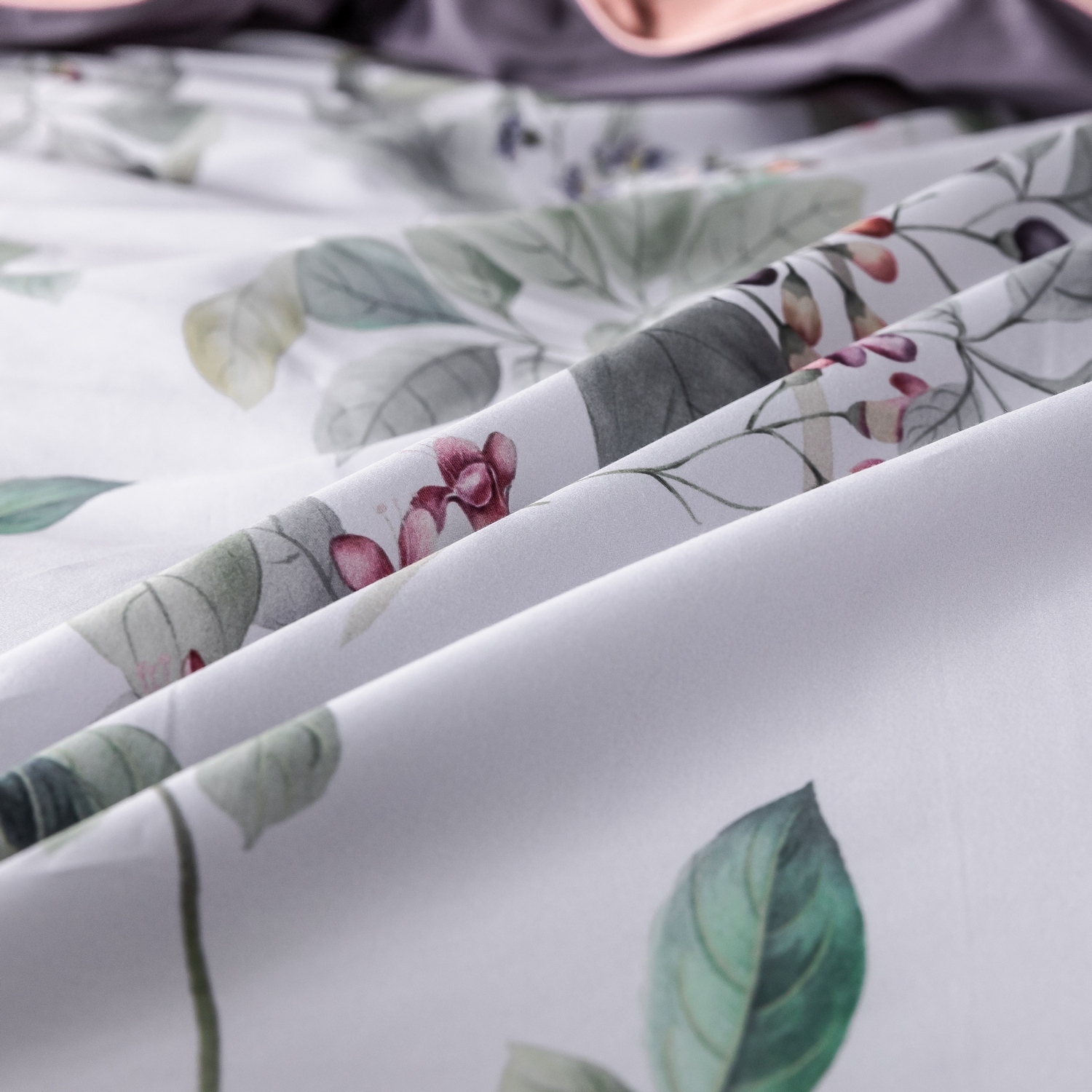 Ткань компаньон: Наволочки 50*70 с разных сторон разной расцветки, наволочки 70*70 однотонные в цвет простыни, пододеяльник с разных сторон разного цвета, простыня однотонная такого же цвета, как низ пододеяльника.