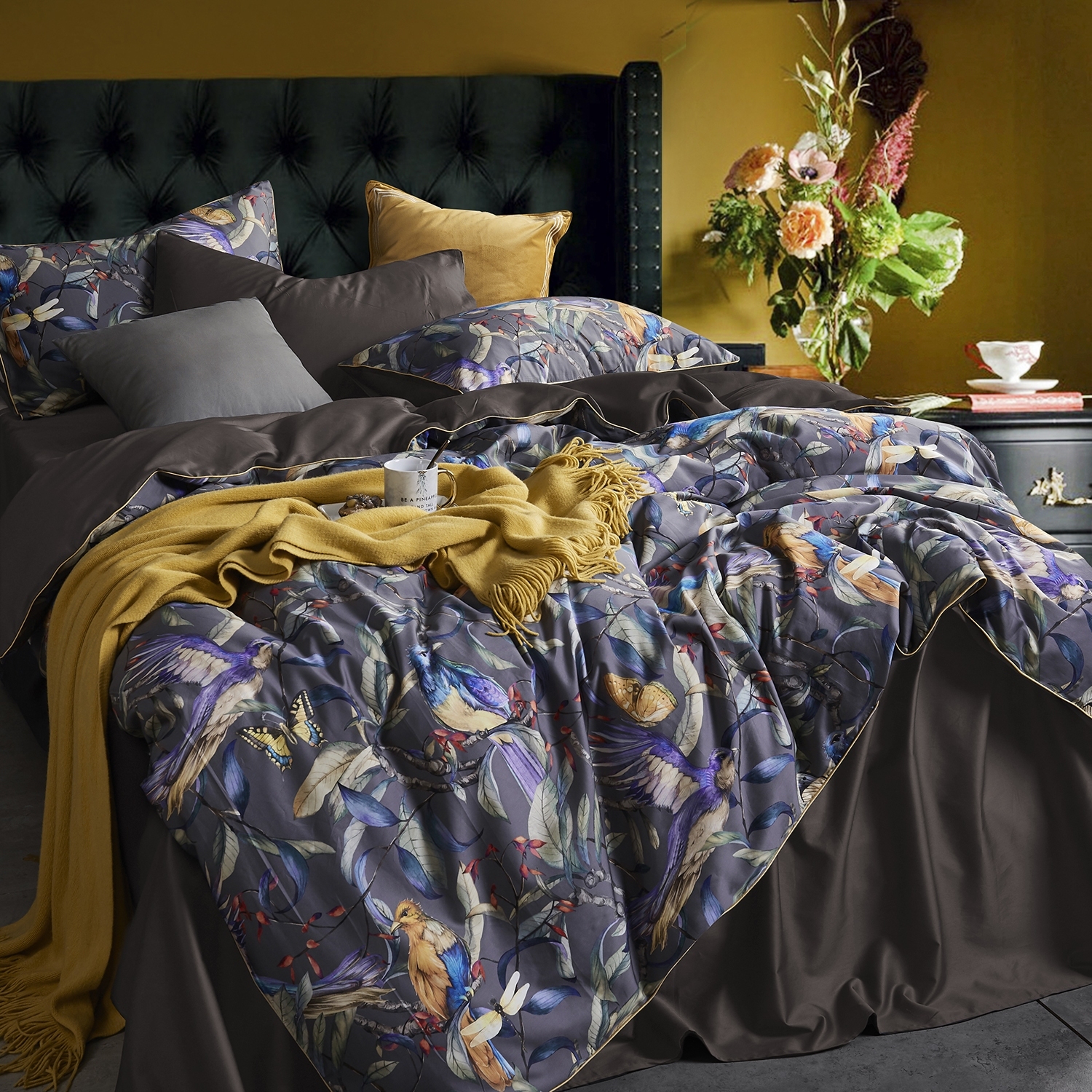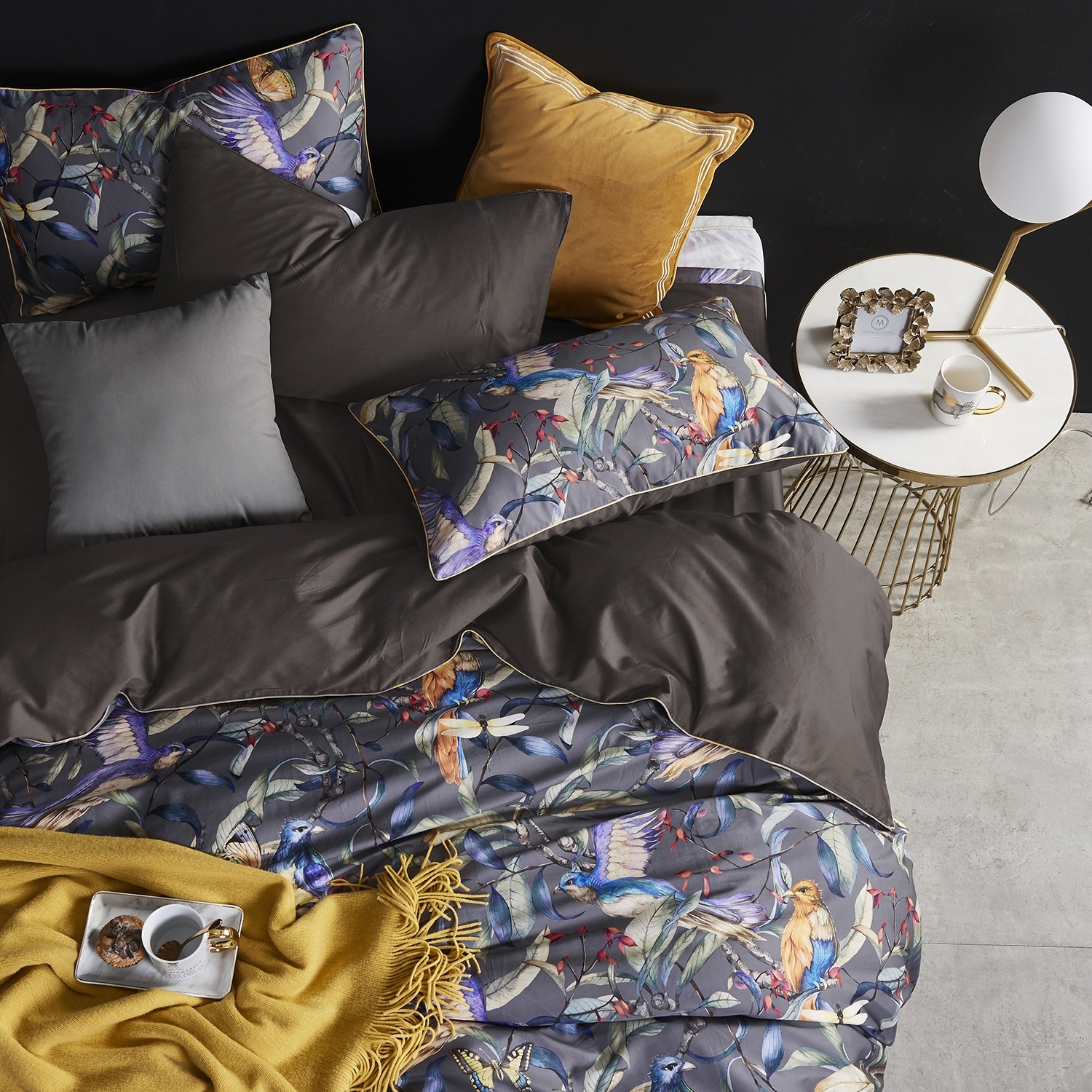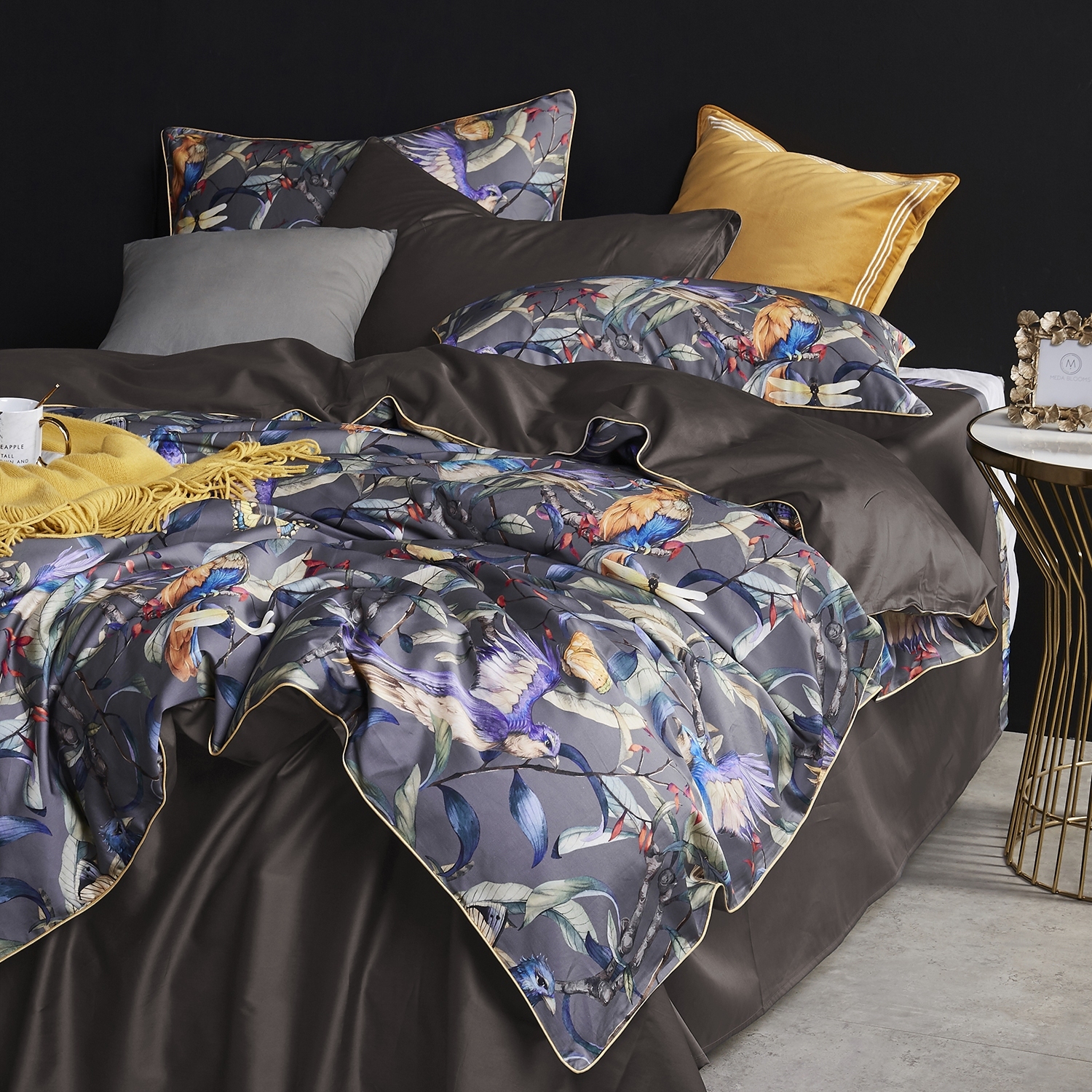 Ткань компаньон: Наволочки 50*70 с разных сторон разной расцветки, наволочки 70*70 однотонные в цвет простыни, пододеяльник с разных сторон разного цвета, простыня однотонная такого же цвета, как низ пододеяльника.
