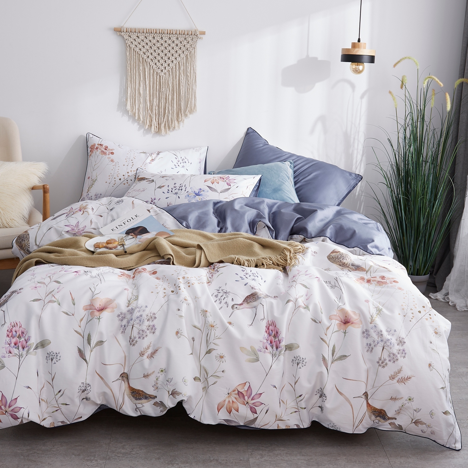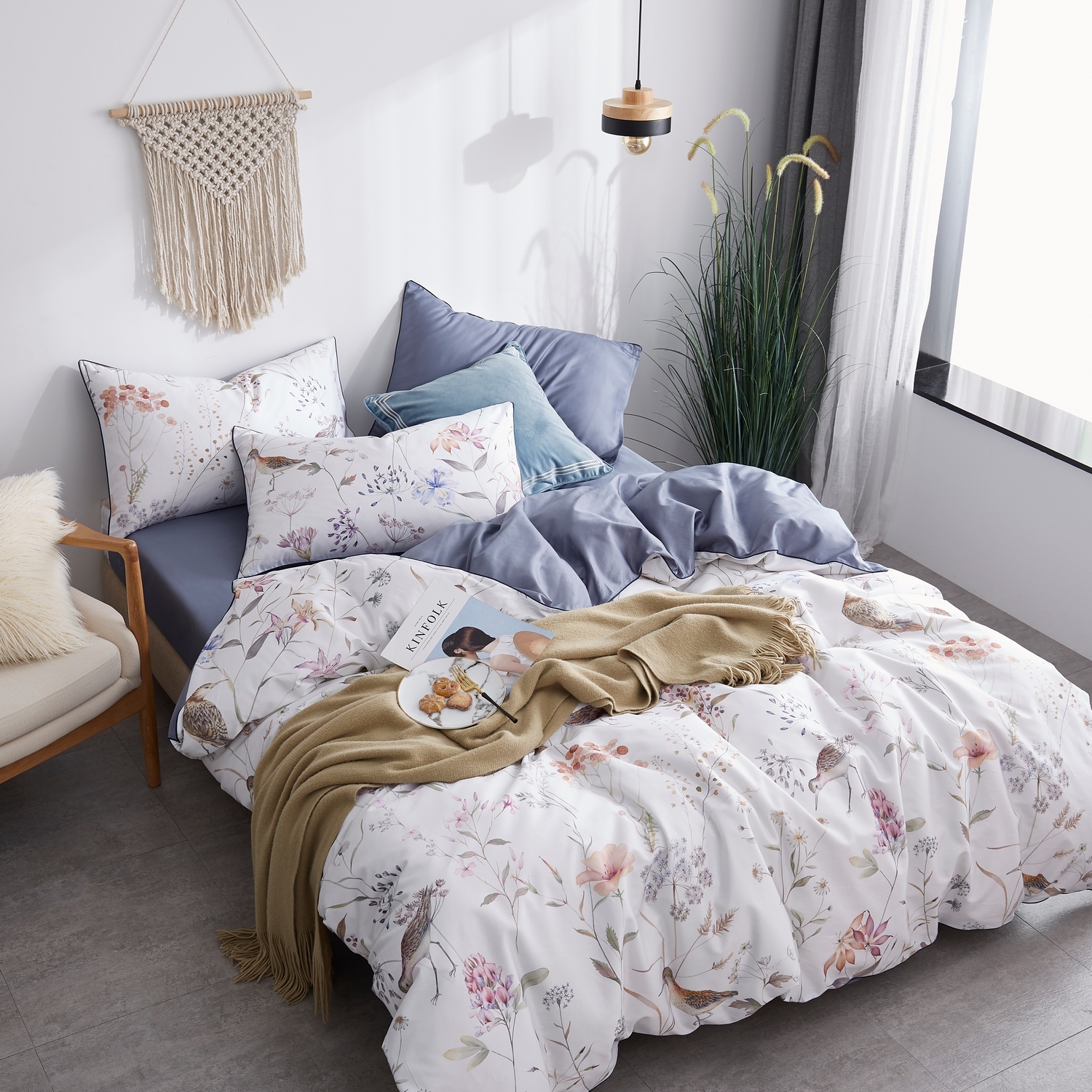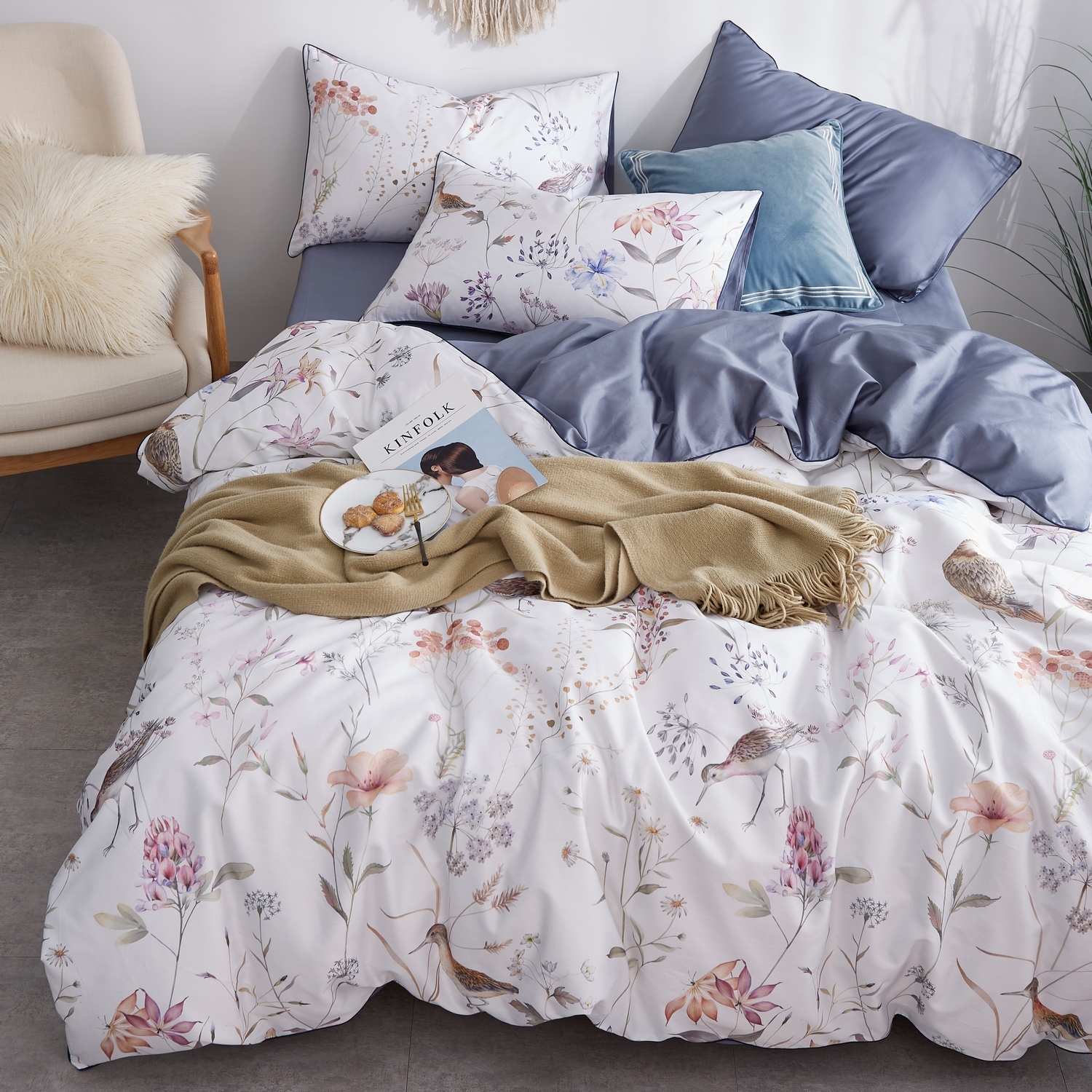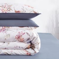 Ткань компаньон: Наволочки 50*70 с разных сторон разной расцветки, наволочки 70*70 однотонные в цвет простыни, пододеяльник с разных сторон разного цвета, простыня однотонная такого же цвета, как низ пододеяльника.