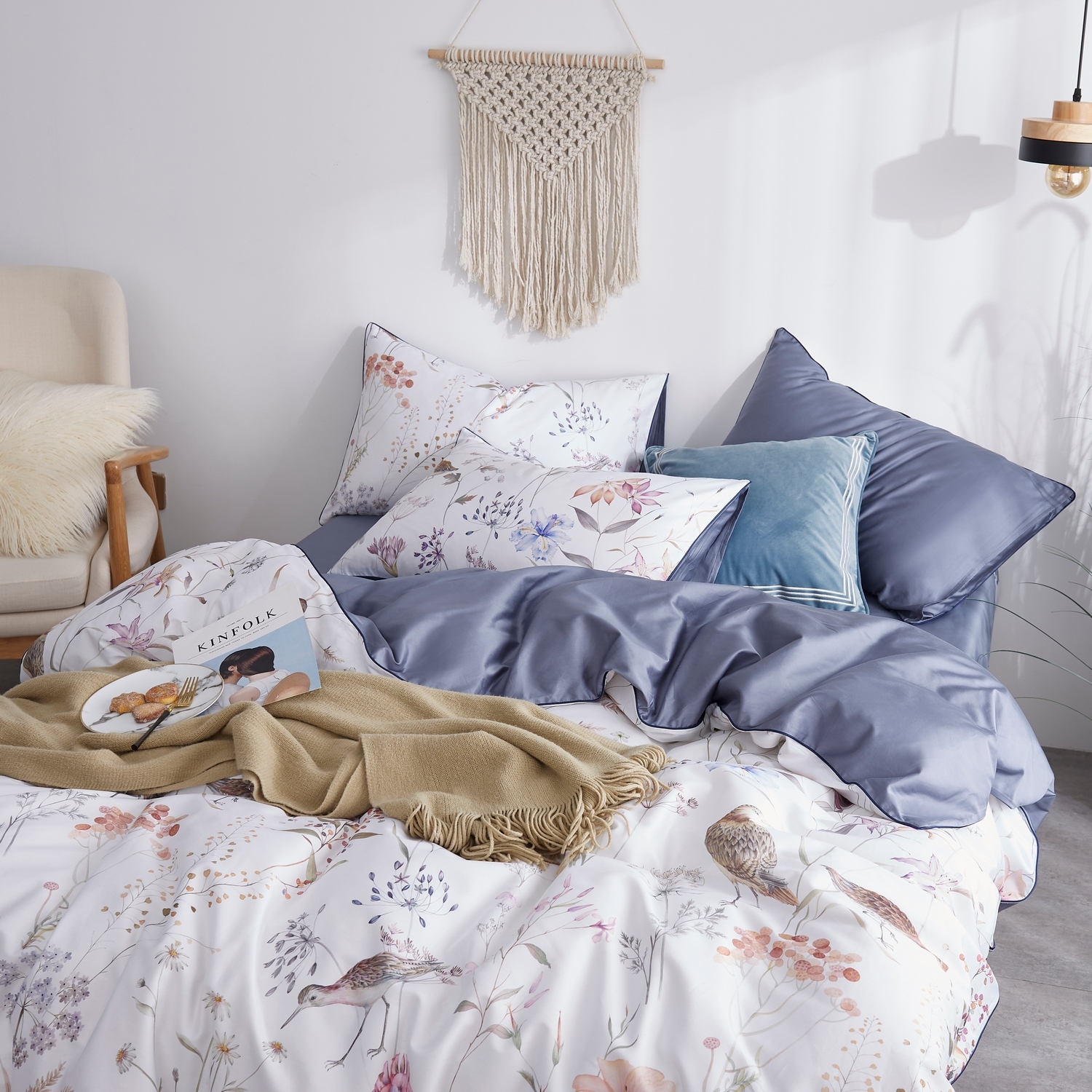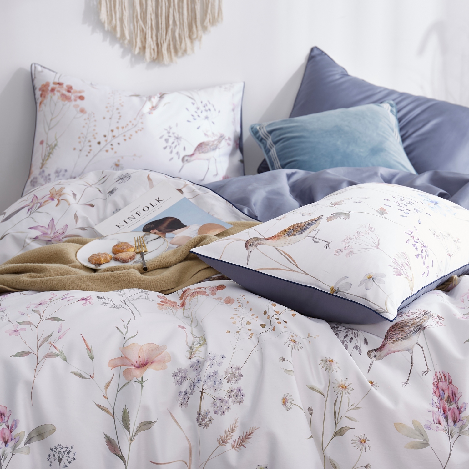 Ткань компаньон: Наволочки 50*70 с разных сторон разной расцветки, наволочки 70*70 однотонные в цвет простыни, пододеяльник с разных сторон разного цвета, простыня однотонная такого же цвета, как низ пододеяльника.