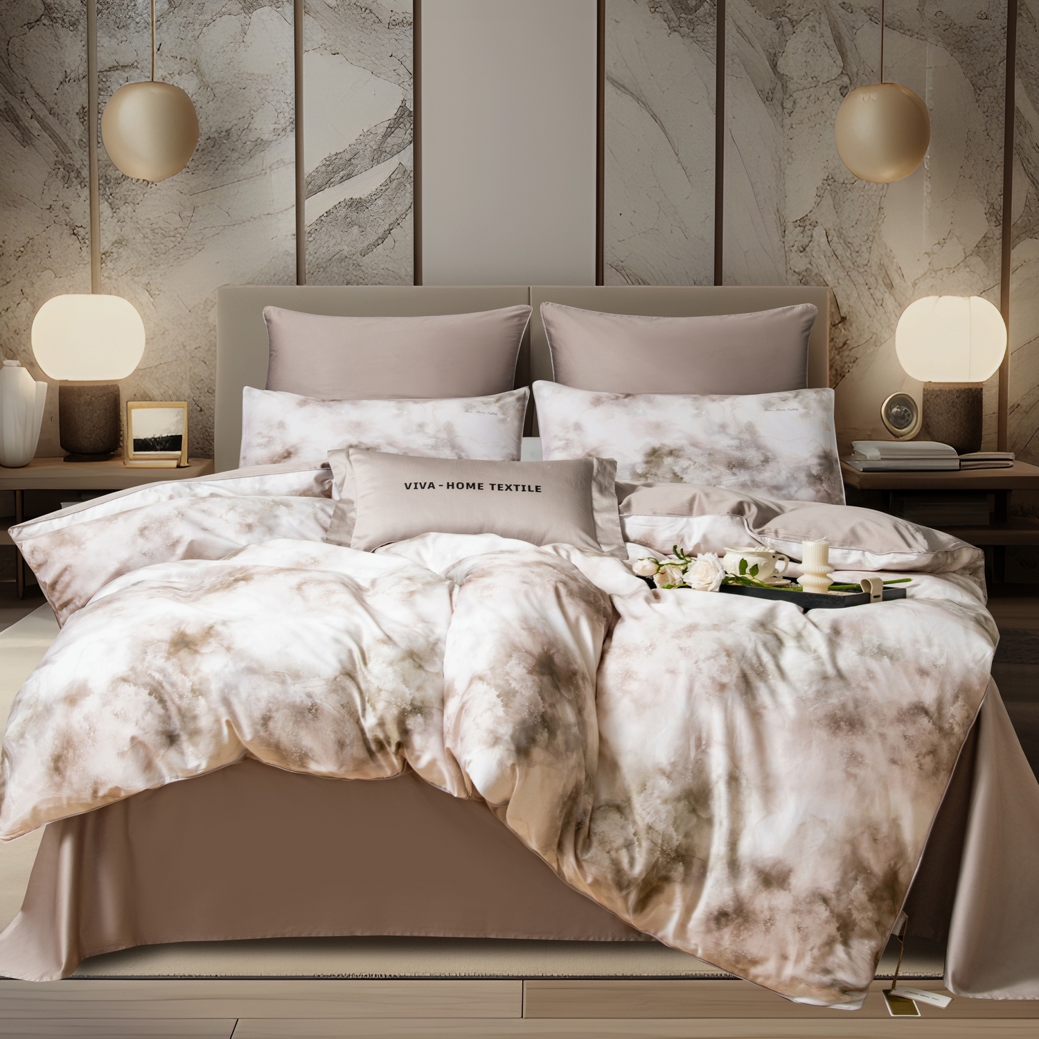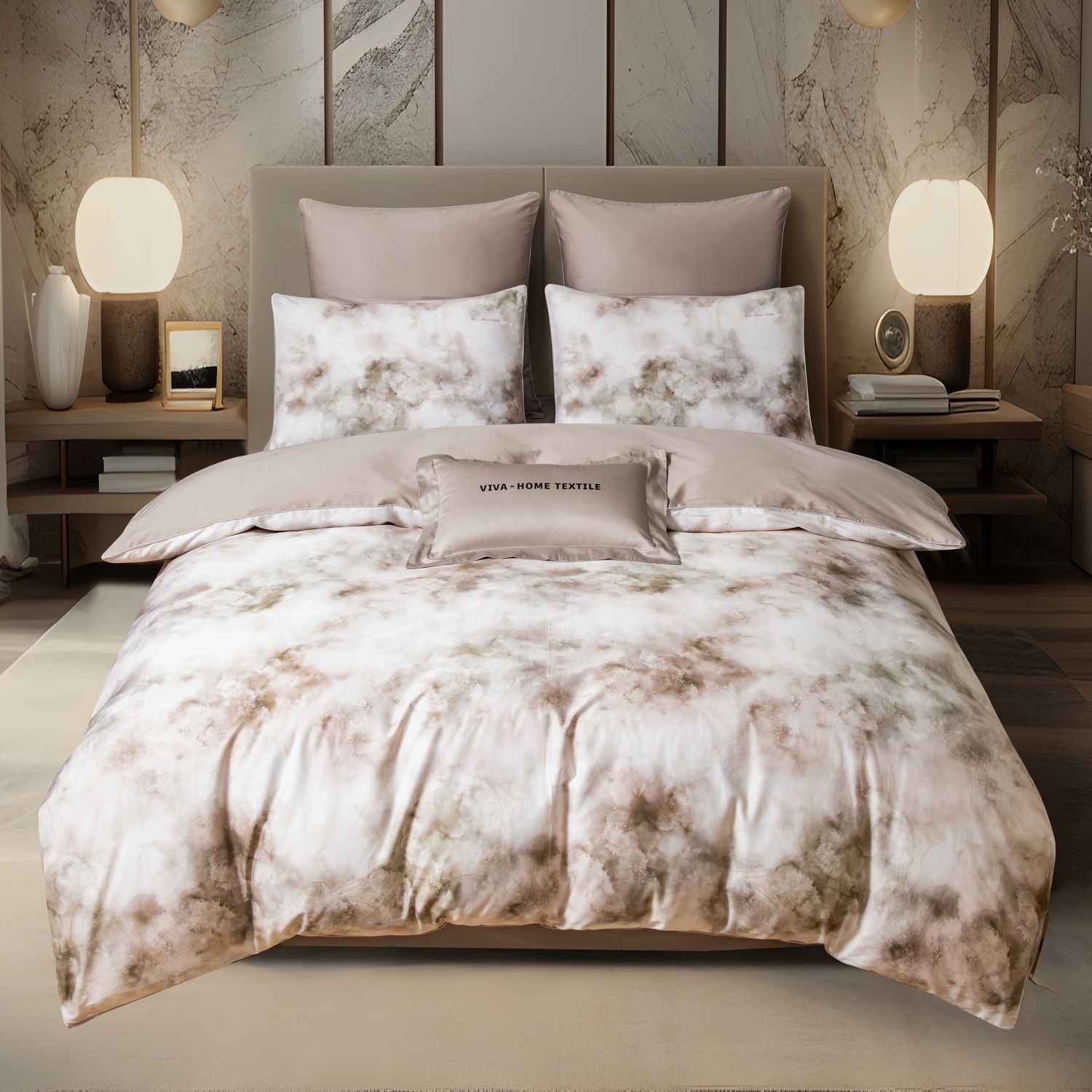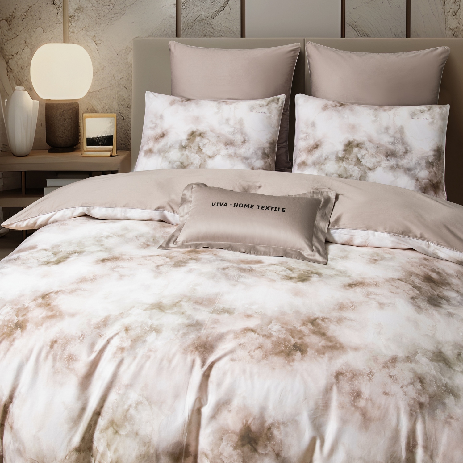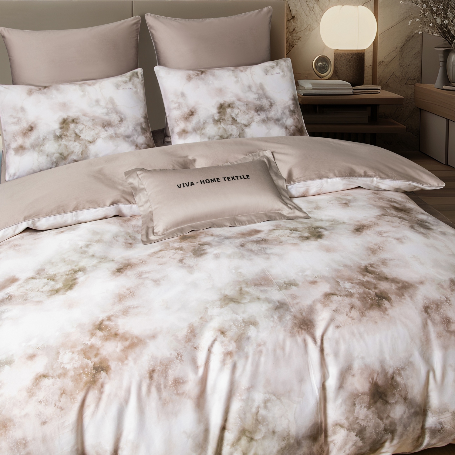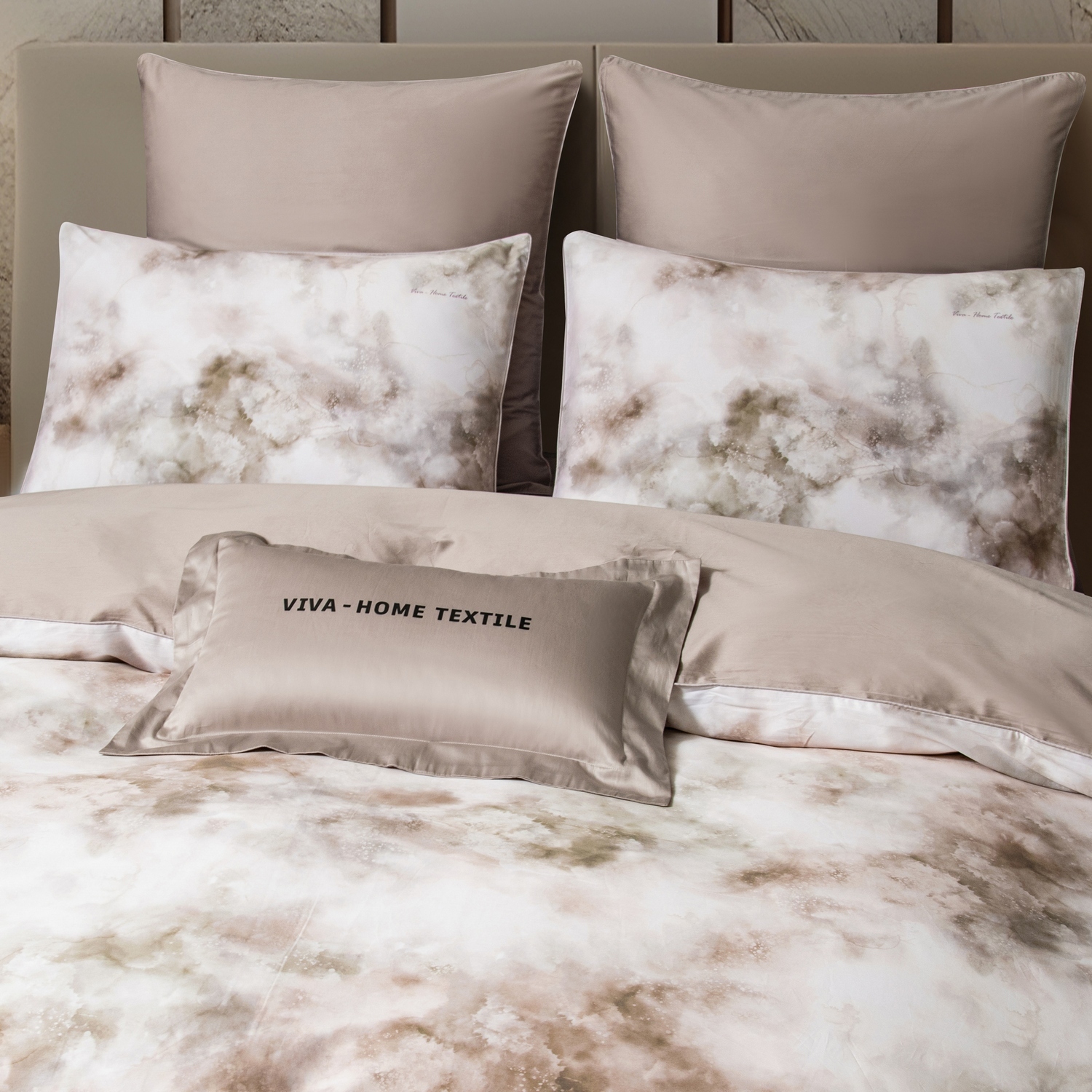 Ткань компаньон: Наволочки 50*70 с разных сторон разной расцветки, наволочки 70*70 однотонные в цвет простыни, пододеяльник с разных сторон разного цвета, простыня однотонная такого же цвета, как низ пододеяльника.