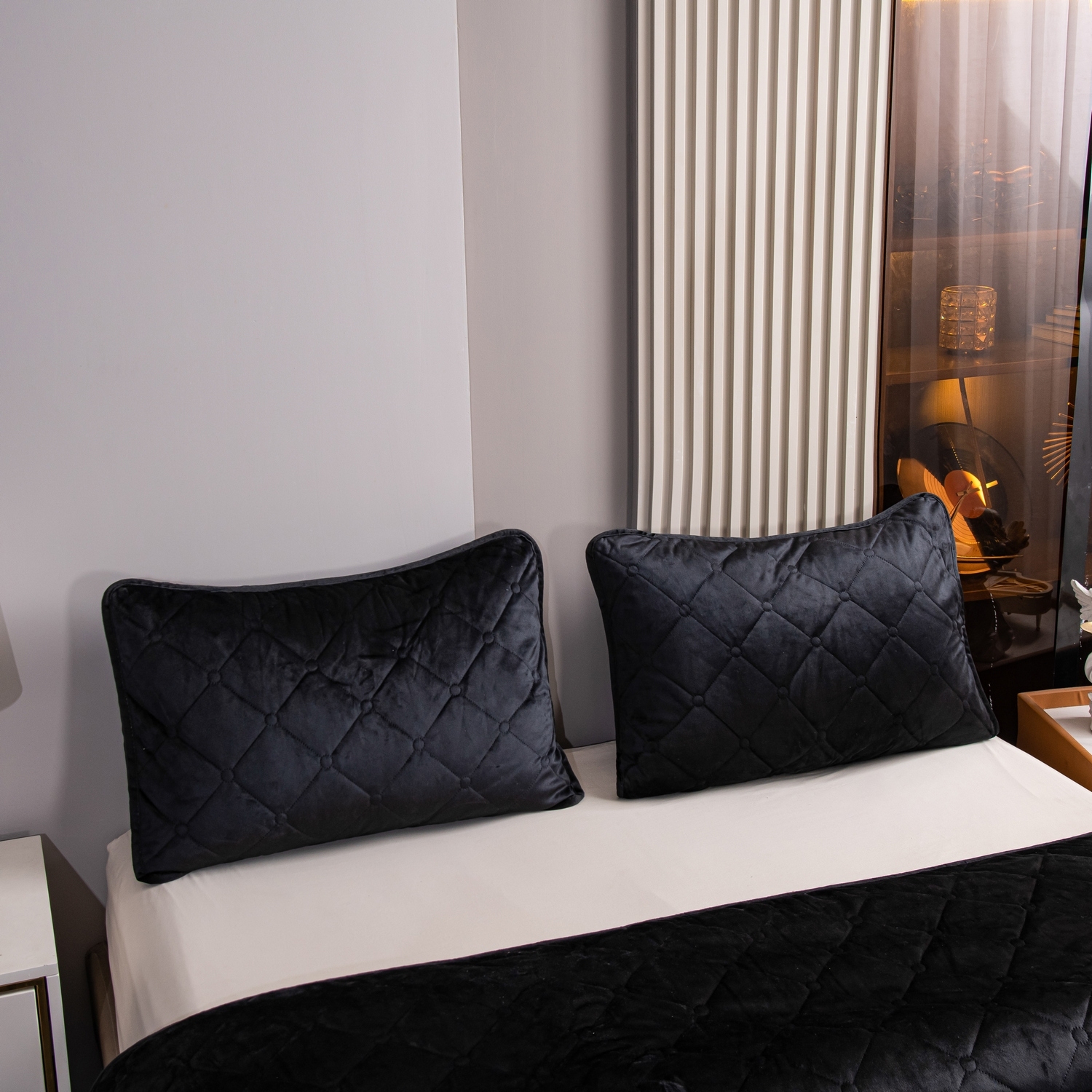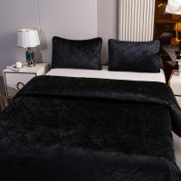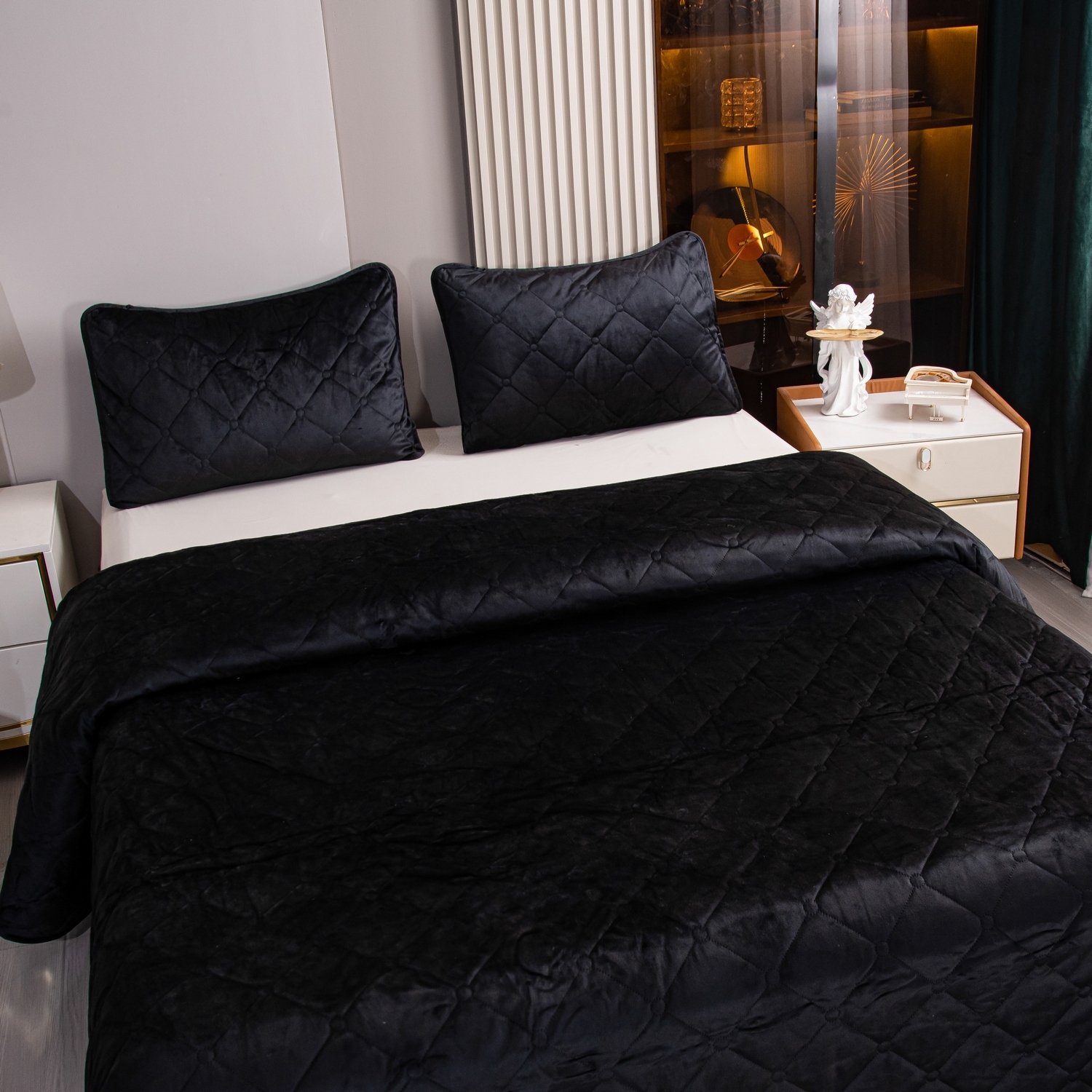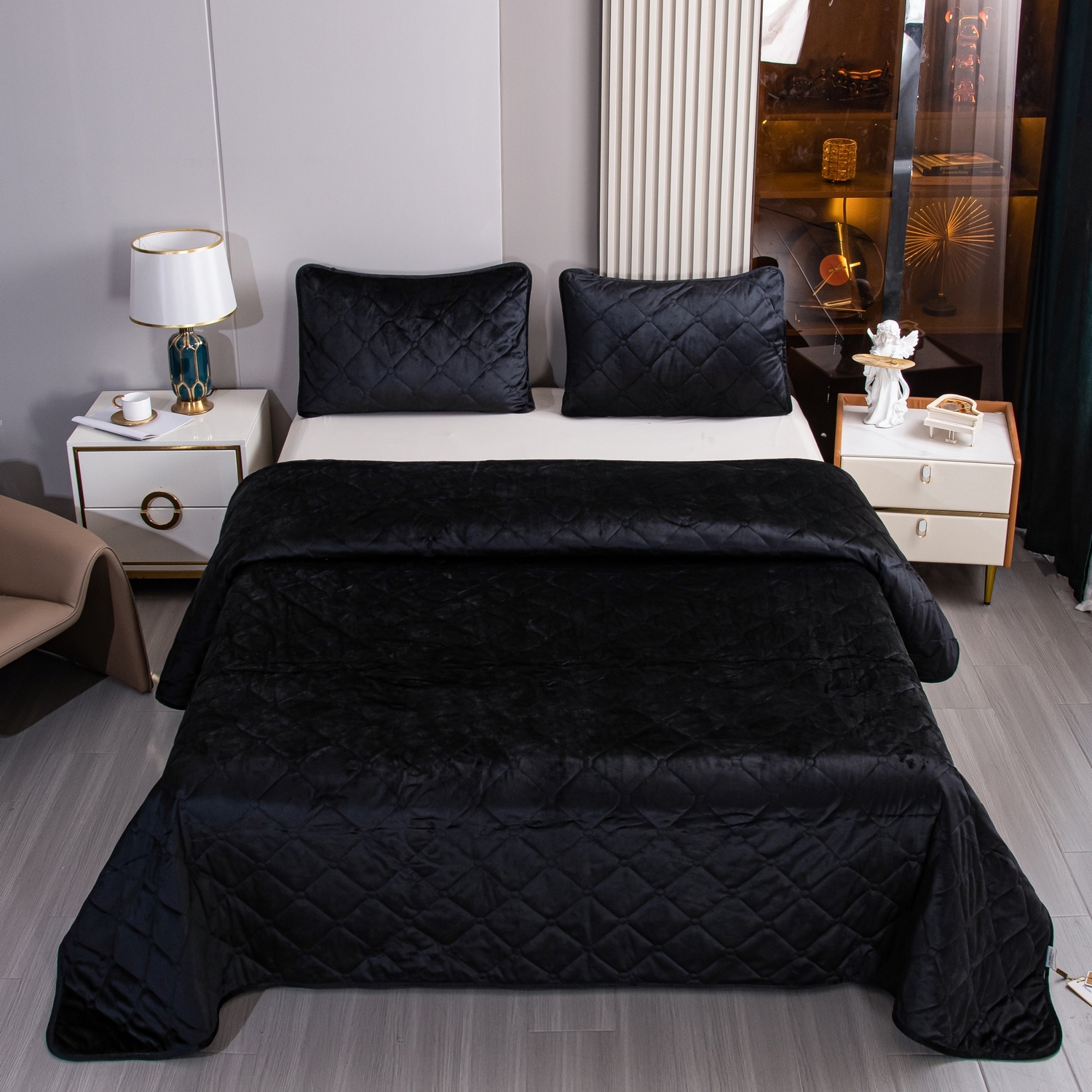 Ромбовидный узор на покрывале выполнен с использованием термостежки, что придаёт изделию особую изысканность и подчёркивает элегантность интерьера.