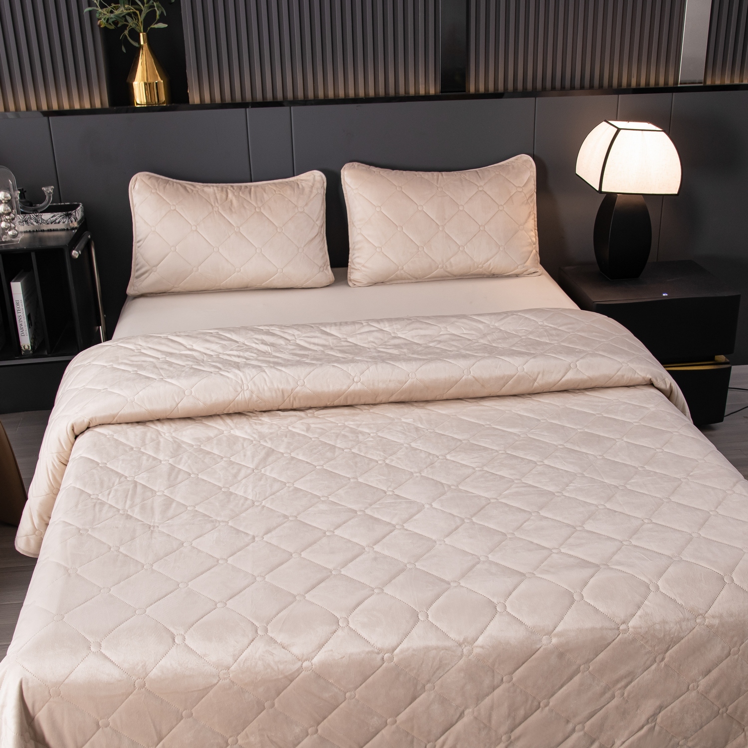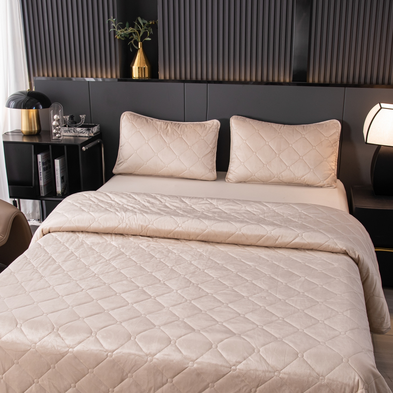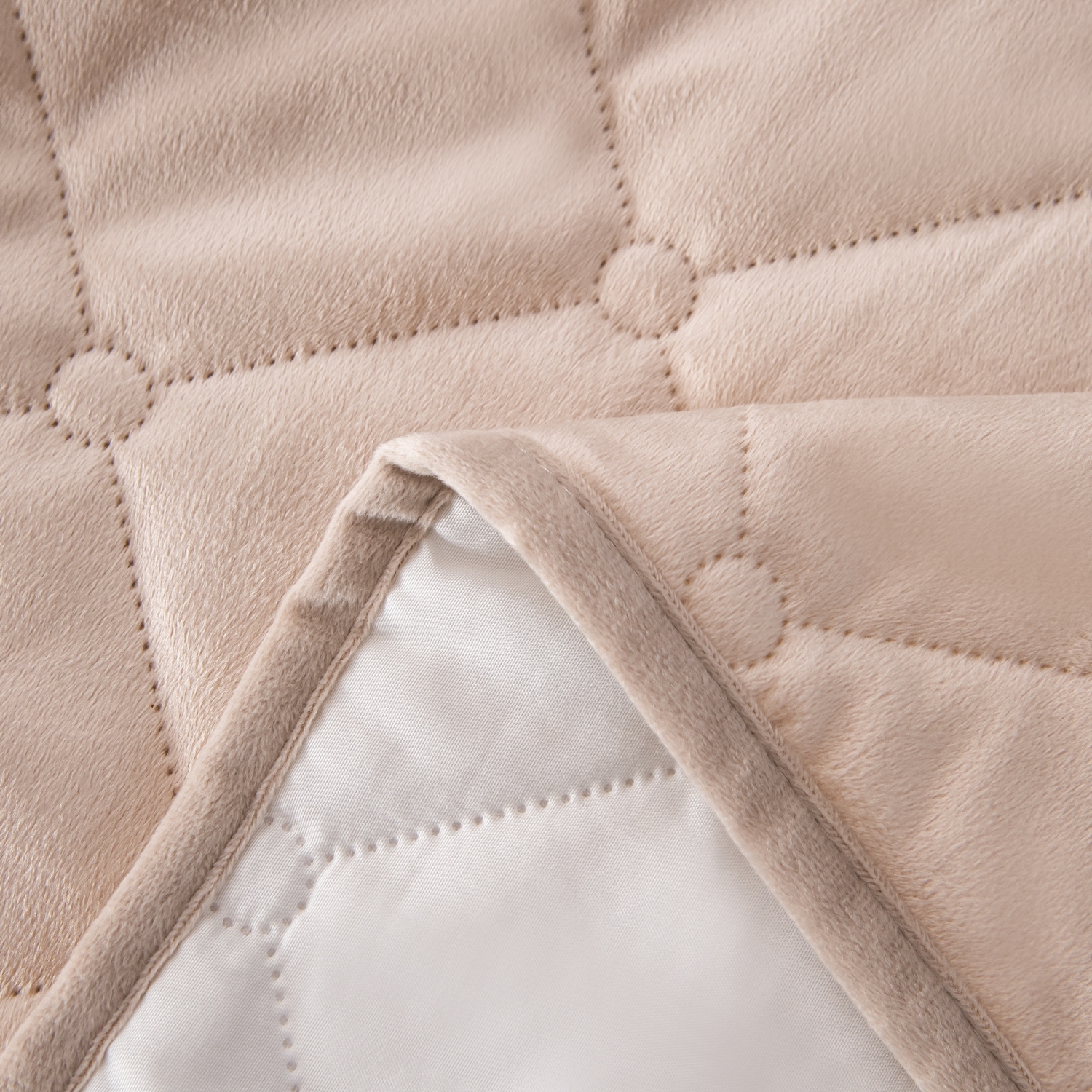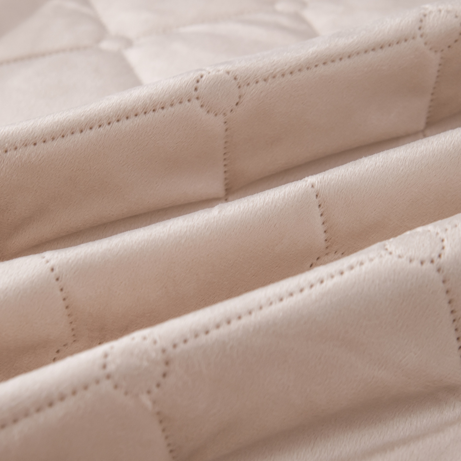 Ромбовидный узор на покрывале выполнен с использованием термостежки, что придаёт изделию особую изысканность и подчёркивает элегантность интерьера.