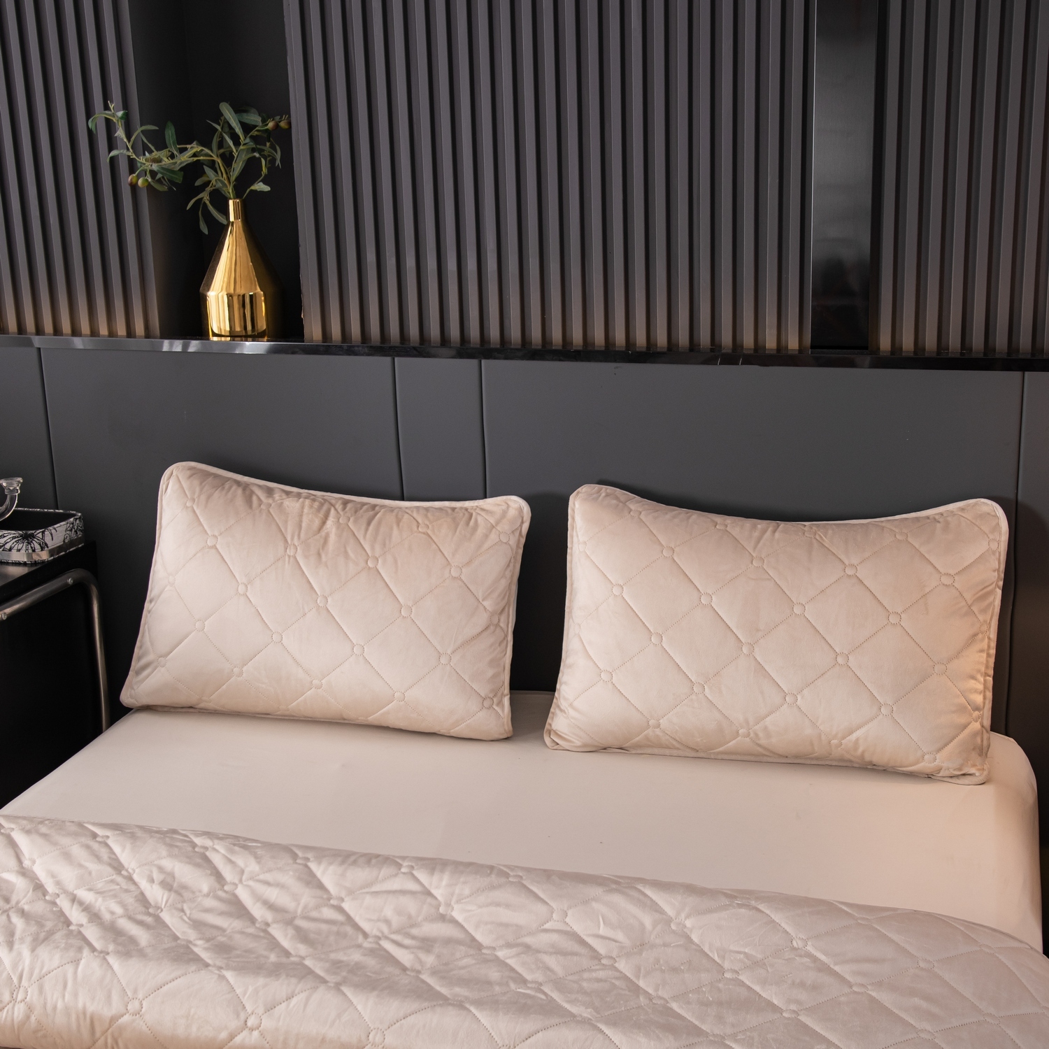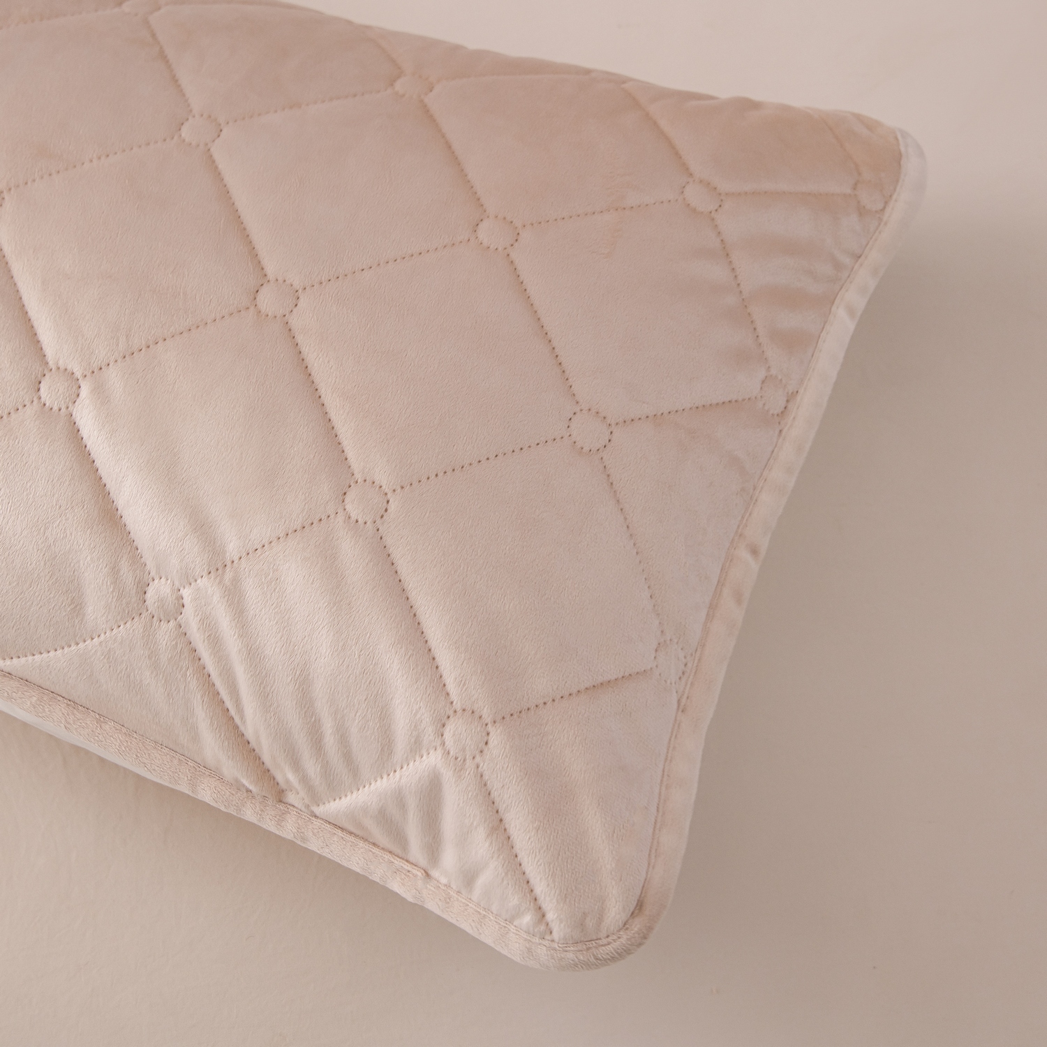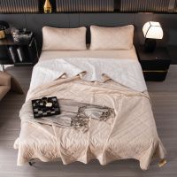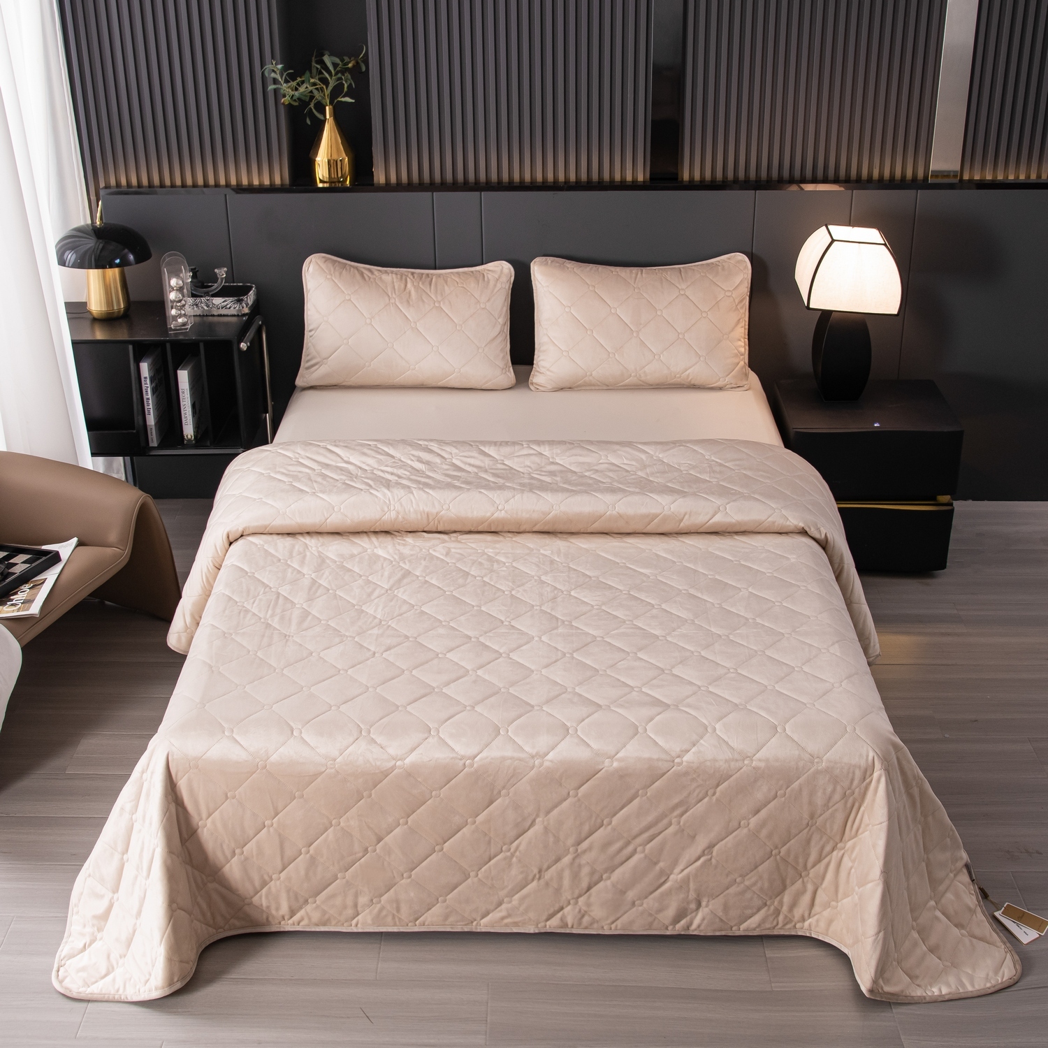 Ромбовидный узор на покрывале выполнен с использованием термостежки, что придаёт изделию особую изысканность и подчёркивает элегантность интерьера.