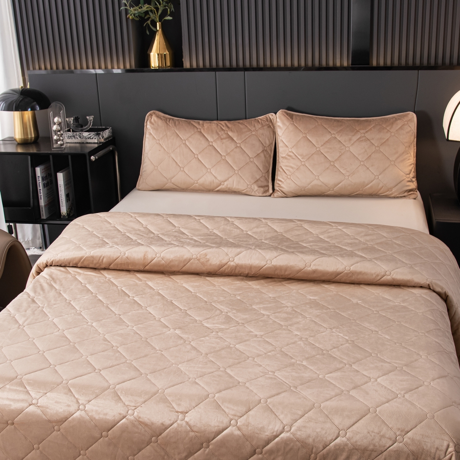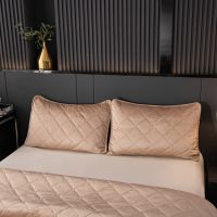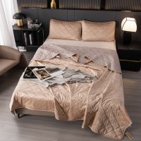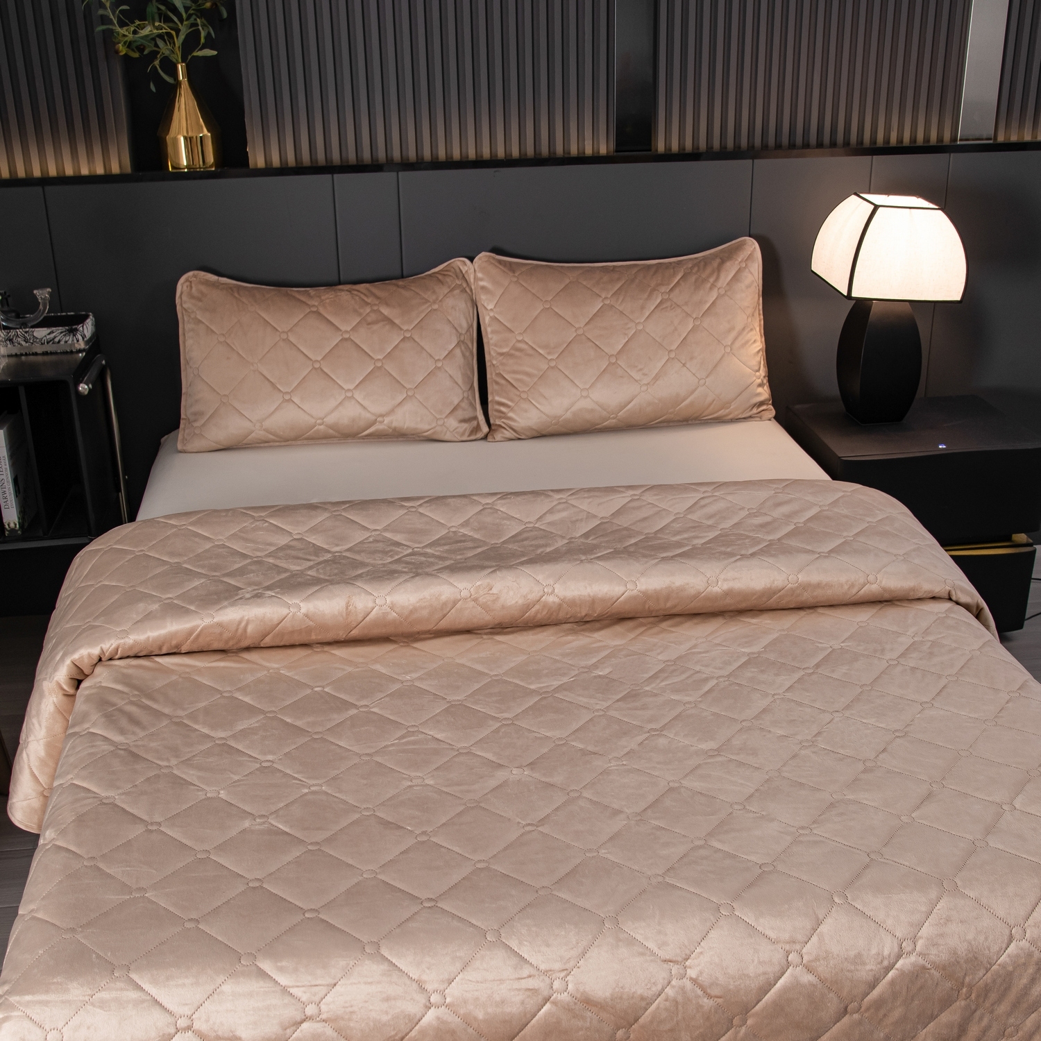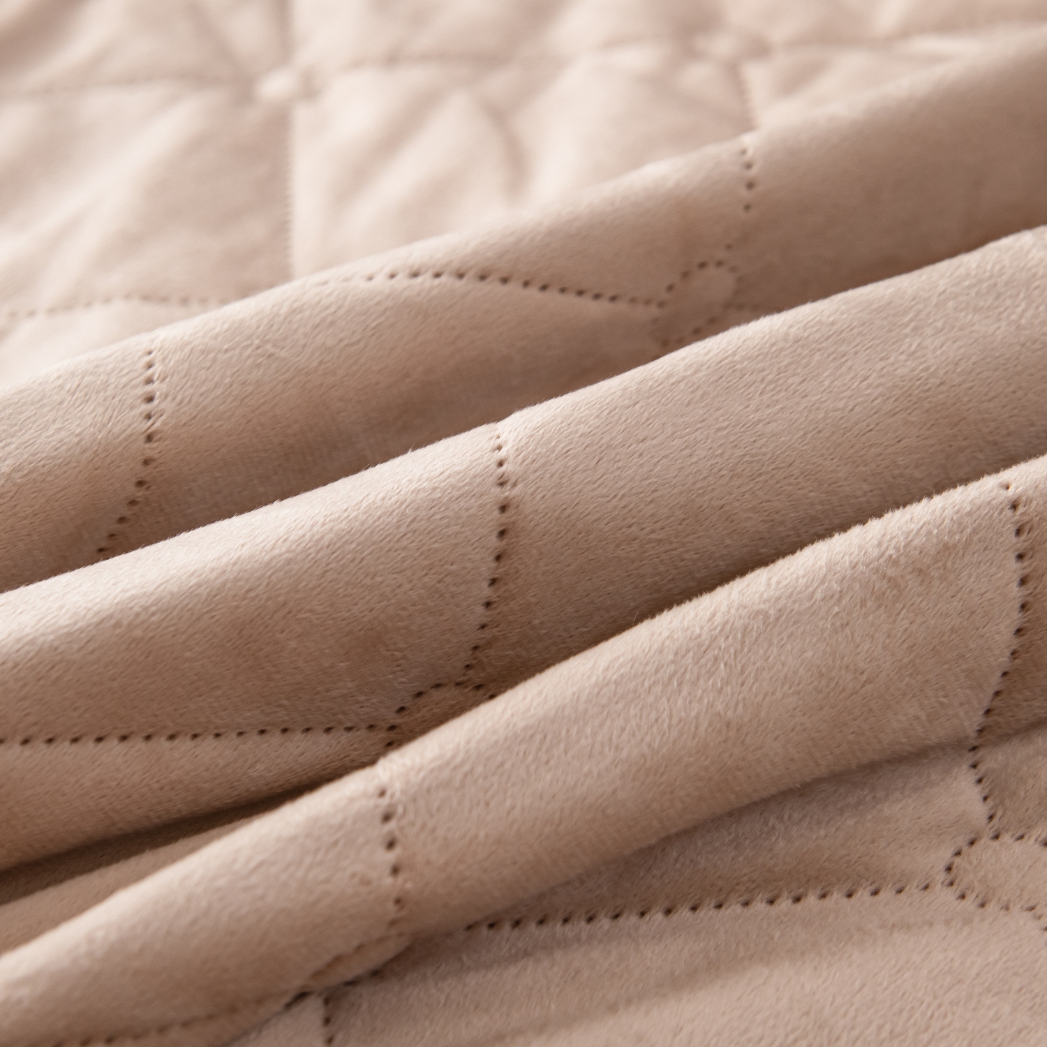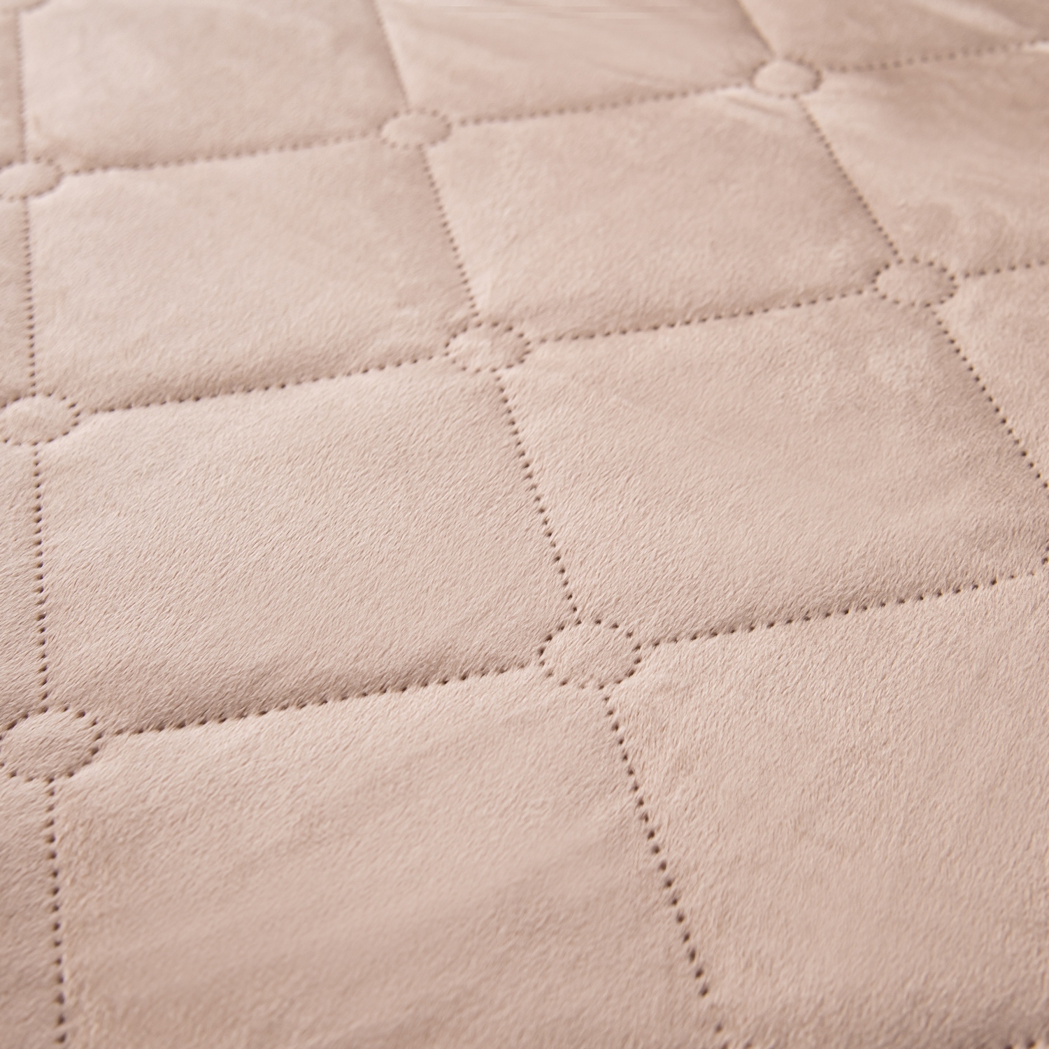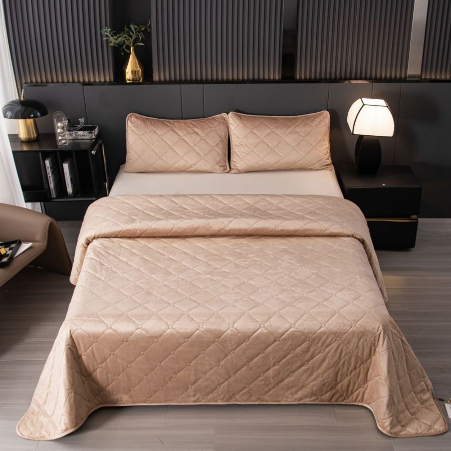 Ромбовидный узор на покрывале выполнен с использованием термостежки, что придаёт изделию особую изысканность и подчёркивает элегантность интерьера.