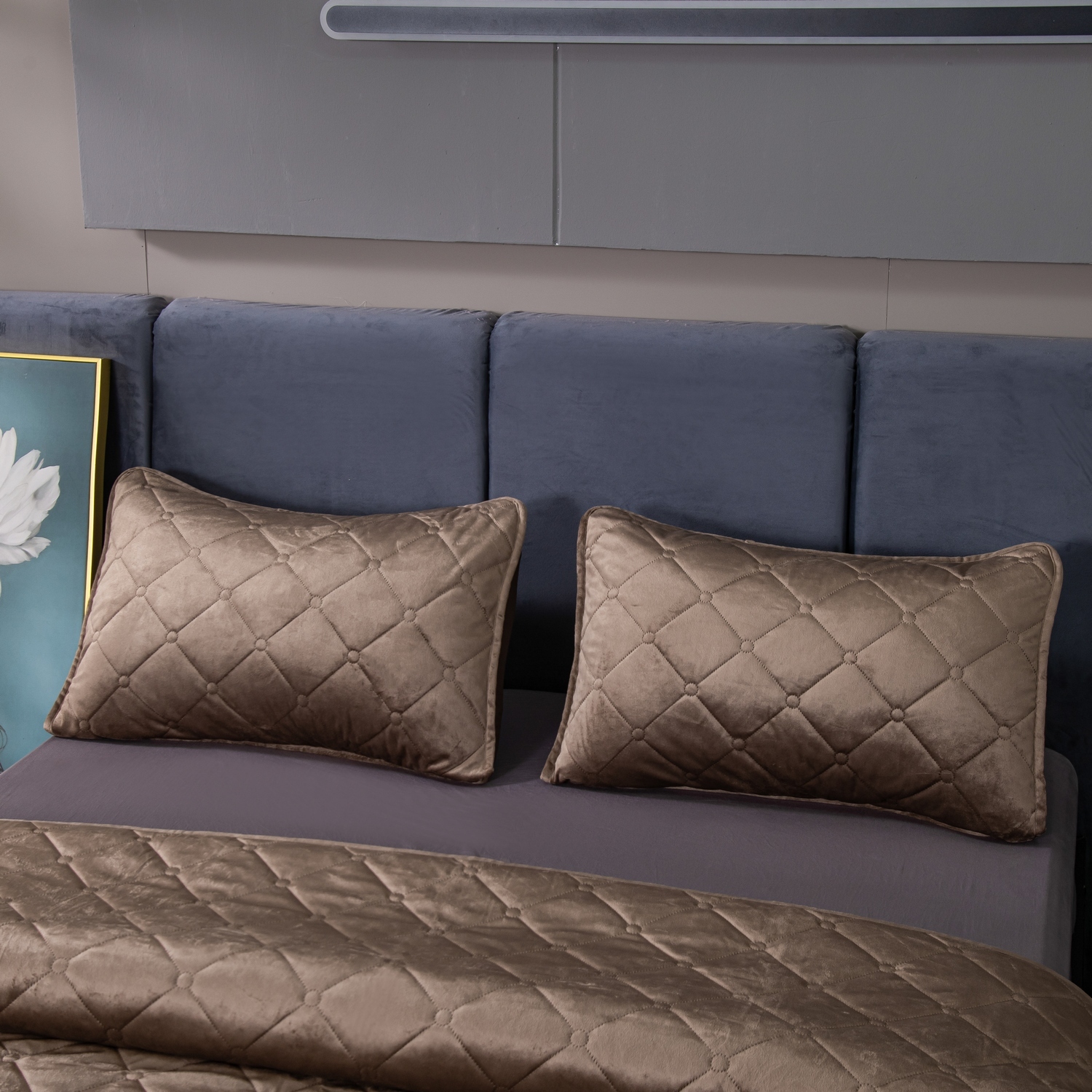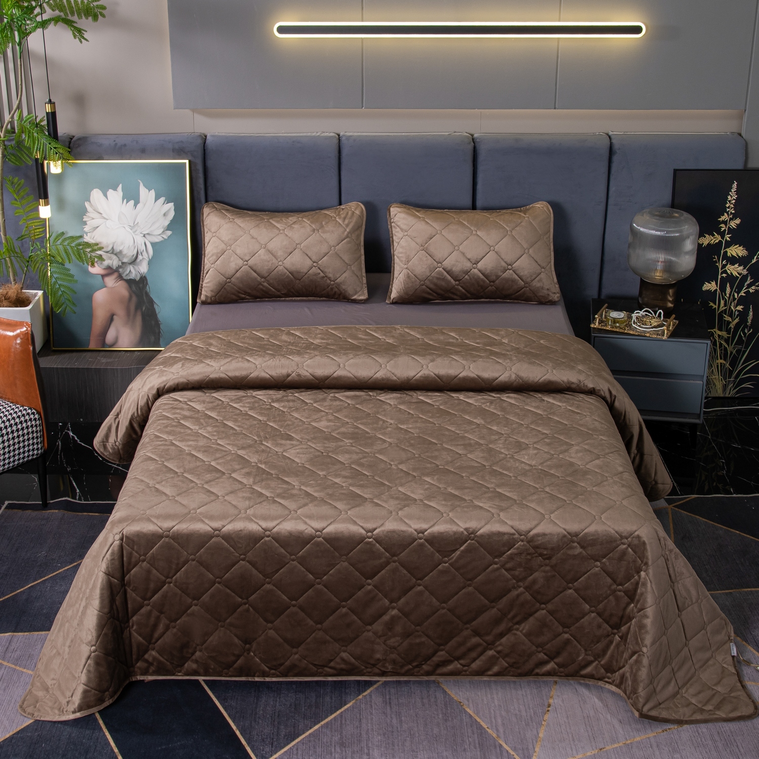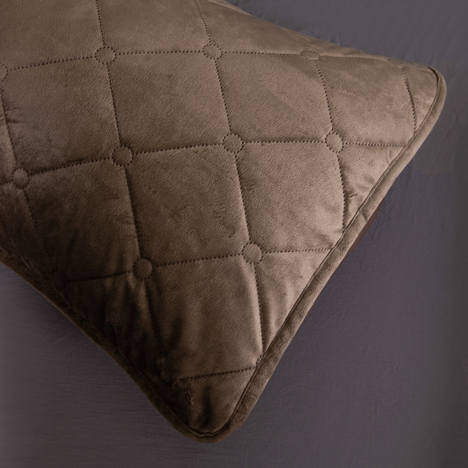 Ромбовидный узор на покрывале выполнен с использованием термостежки, что придаёт изделию особую изысканность и подчёркивает элегантность интерьера.
